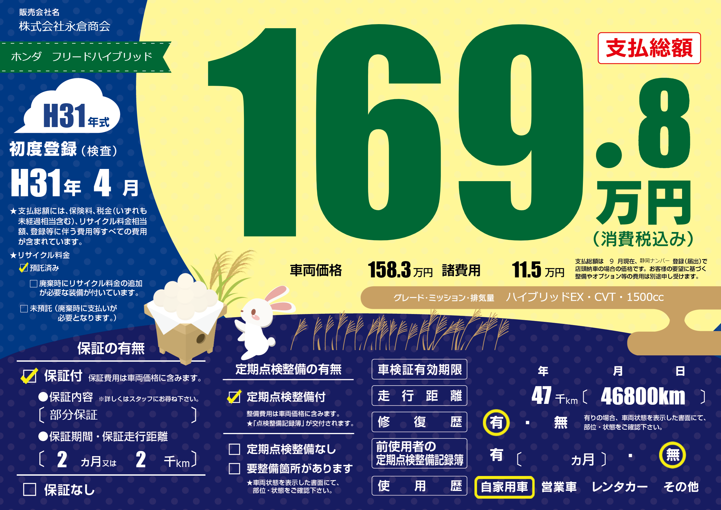 | 車名 | ホンダ フリードハイブリッド | グレード ミッション 排気量 |