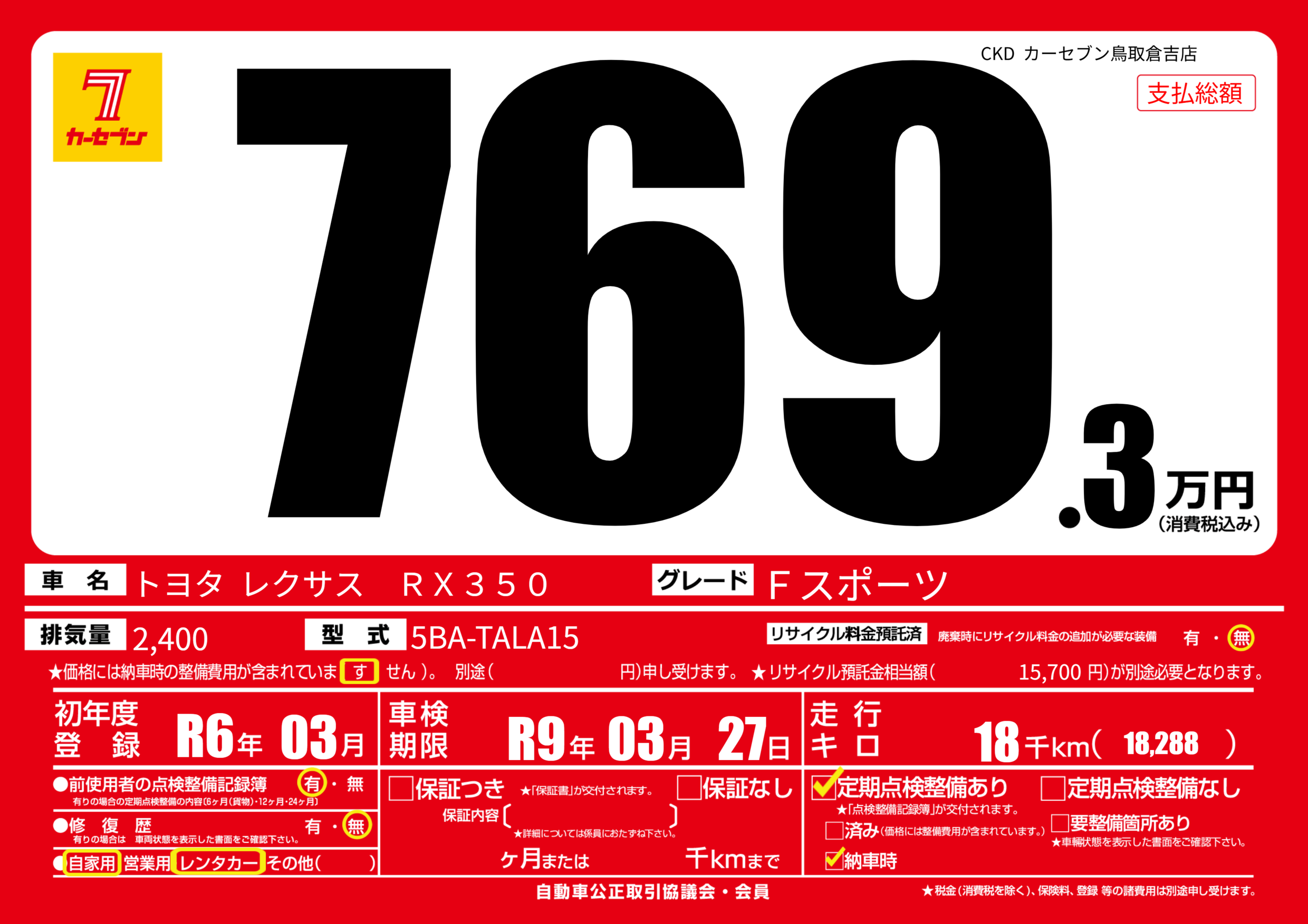 | 車名 | トヨタ レクサス RX350 | グレード ミッション 排気量 |