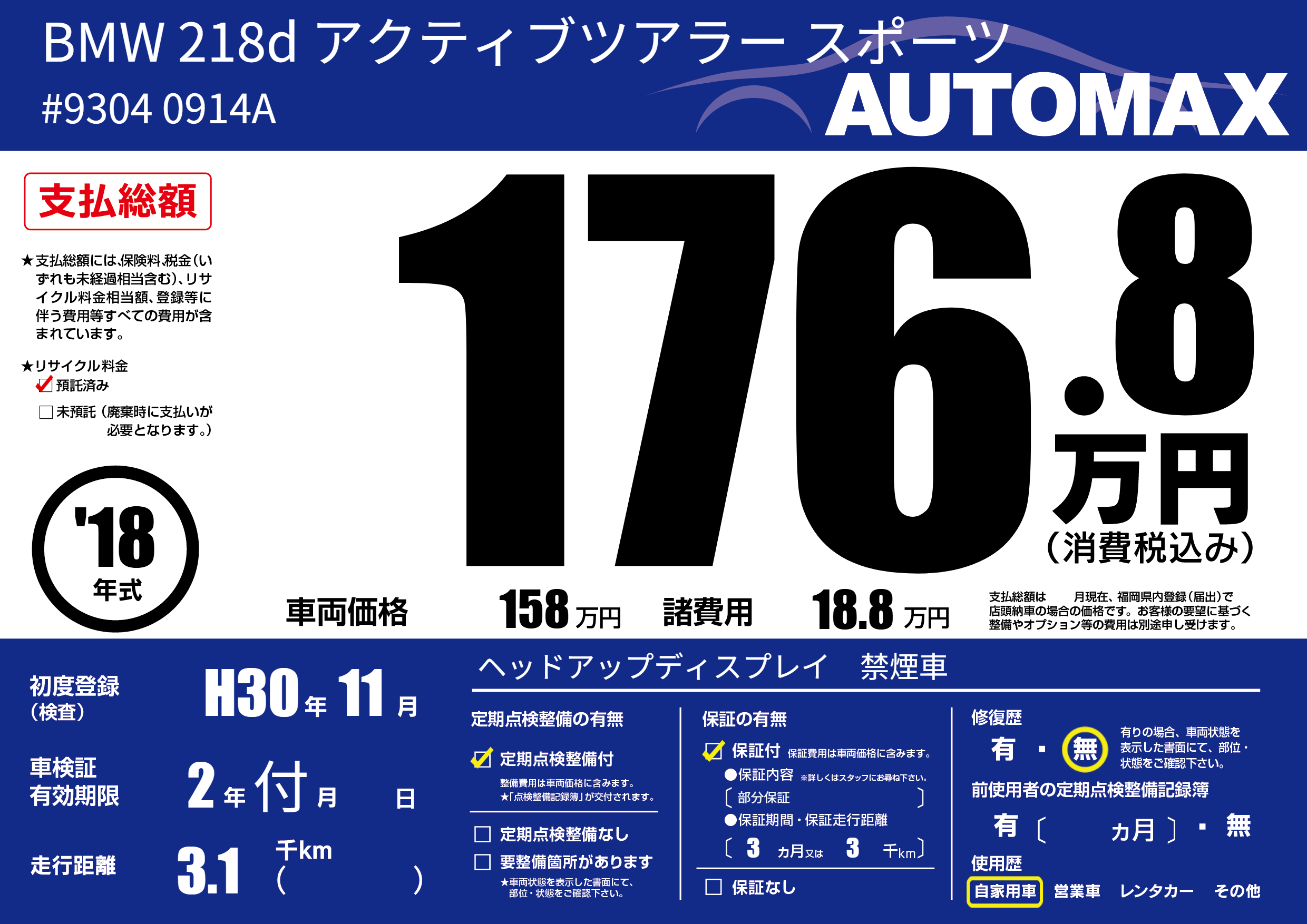| 車名 | BMW 218d アクティブツアラー スポーツ | グレード ミッション 排気量 |