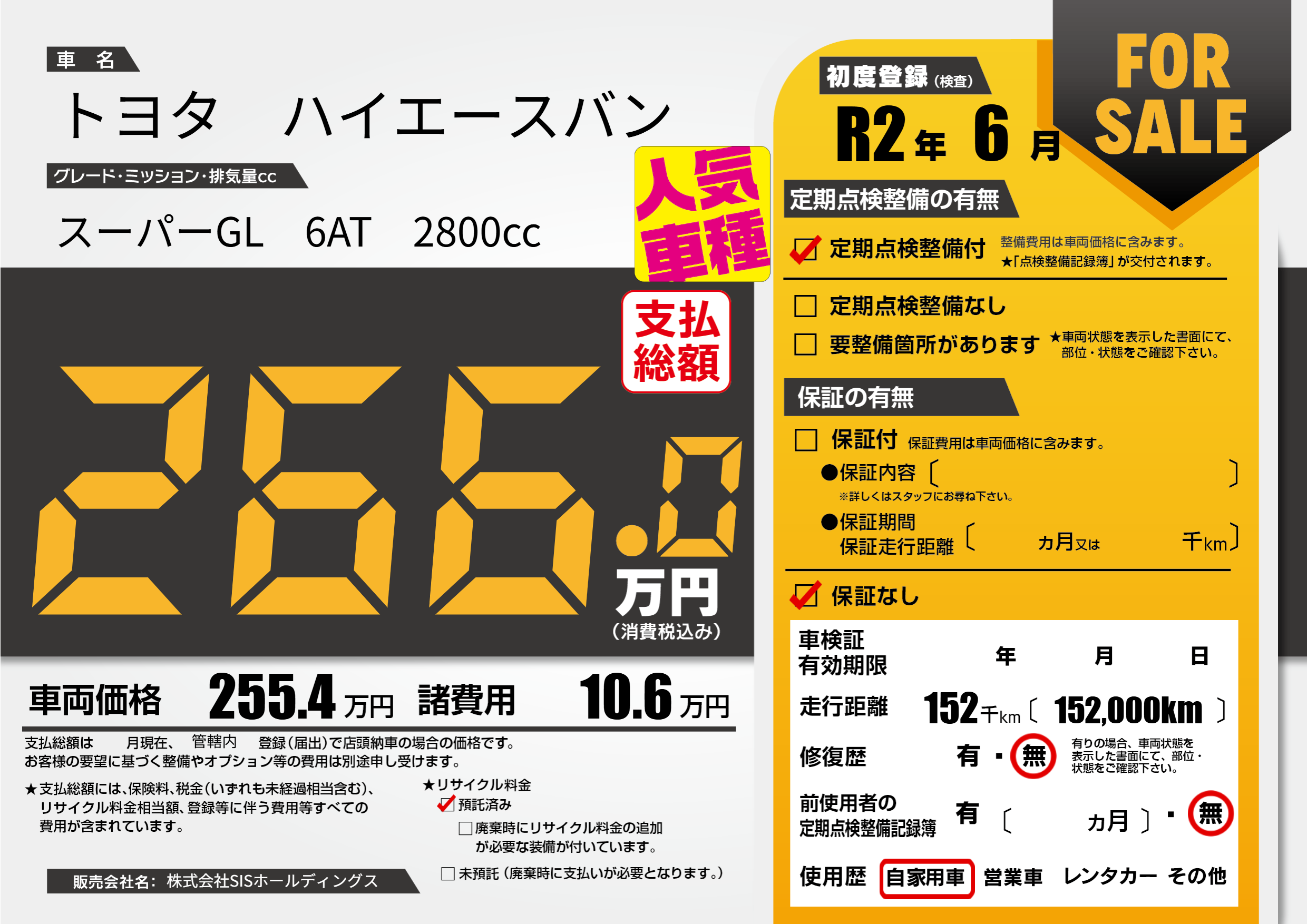 | 走行キロ | 15.2万km | 初年度登録 | R2年6月 |