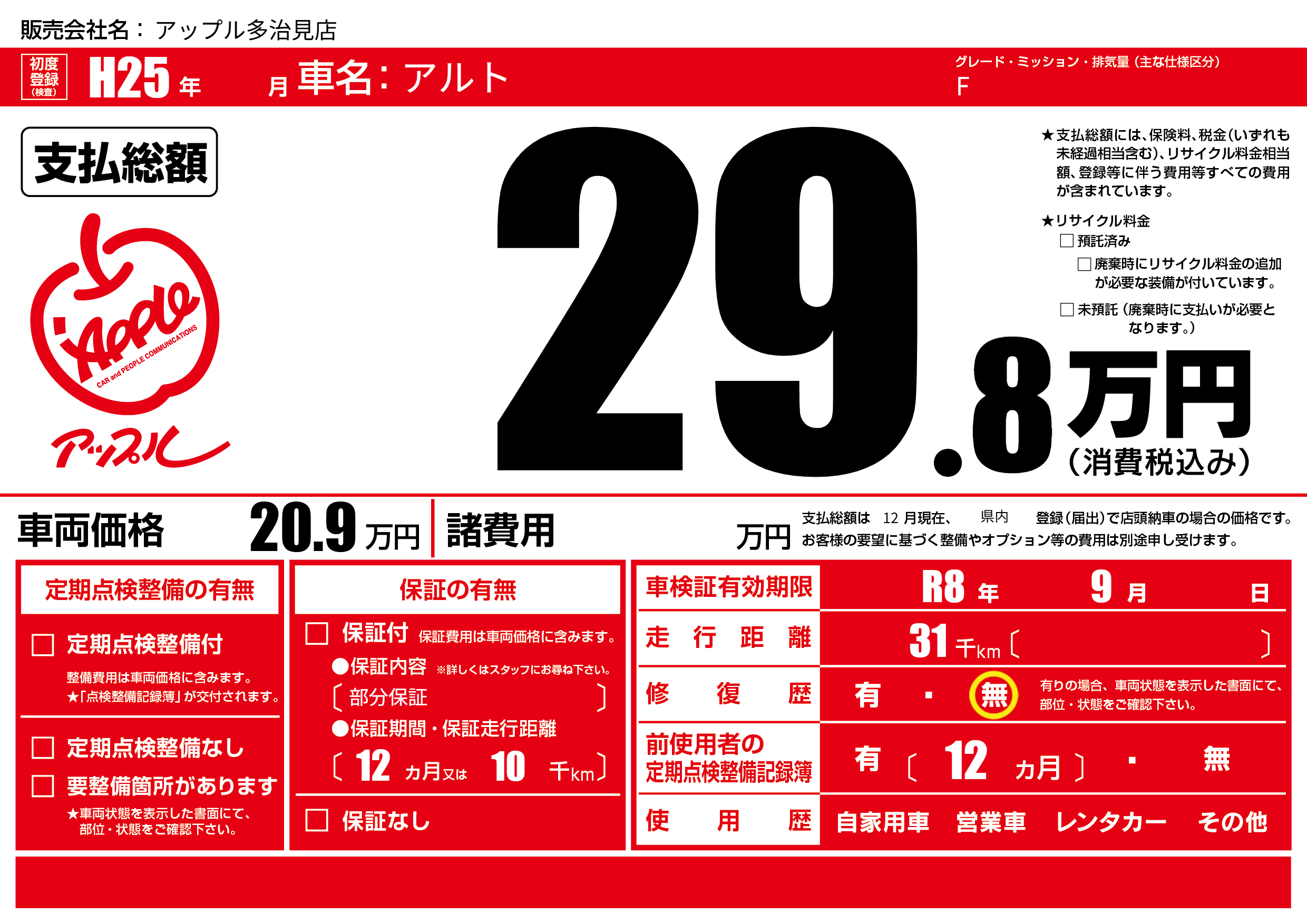 | 走行キロ | 3.1万km | 初年度登録 | H25年---月 |