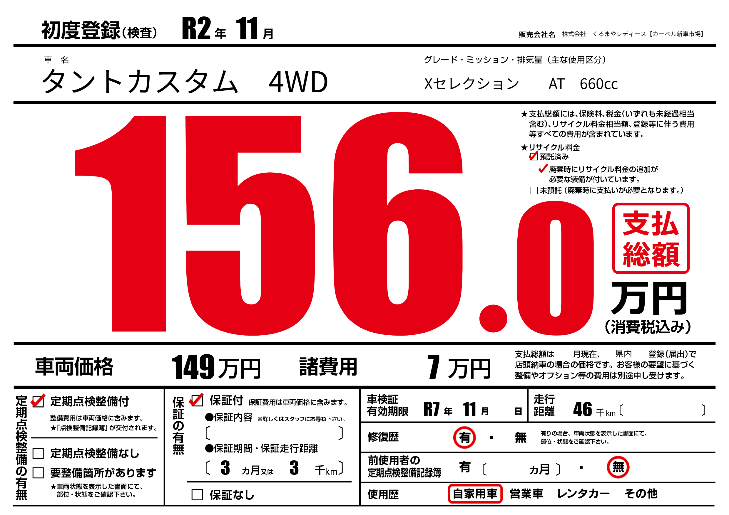 | 走行キロ | 4.6万km | 初年度登録 | R2年11月 |