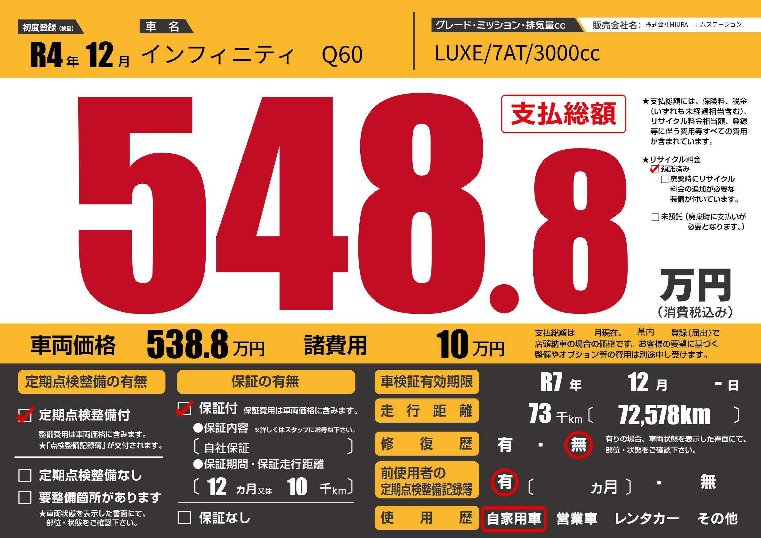 | 車名 | インフィニティ Q60 | グレード ミッション 排気量 |