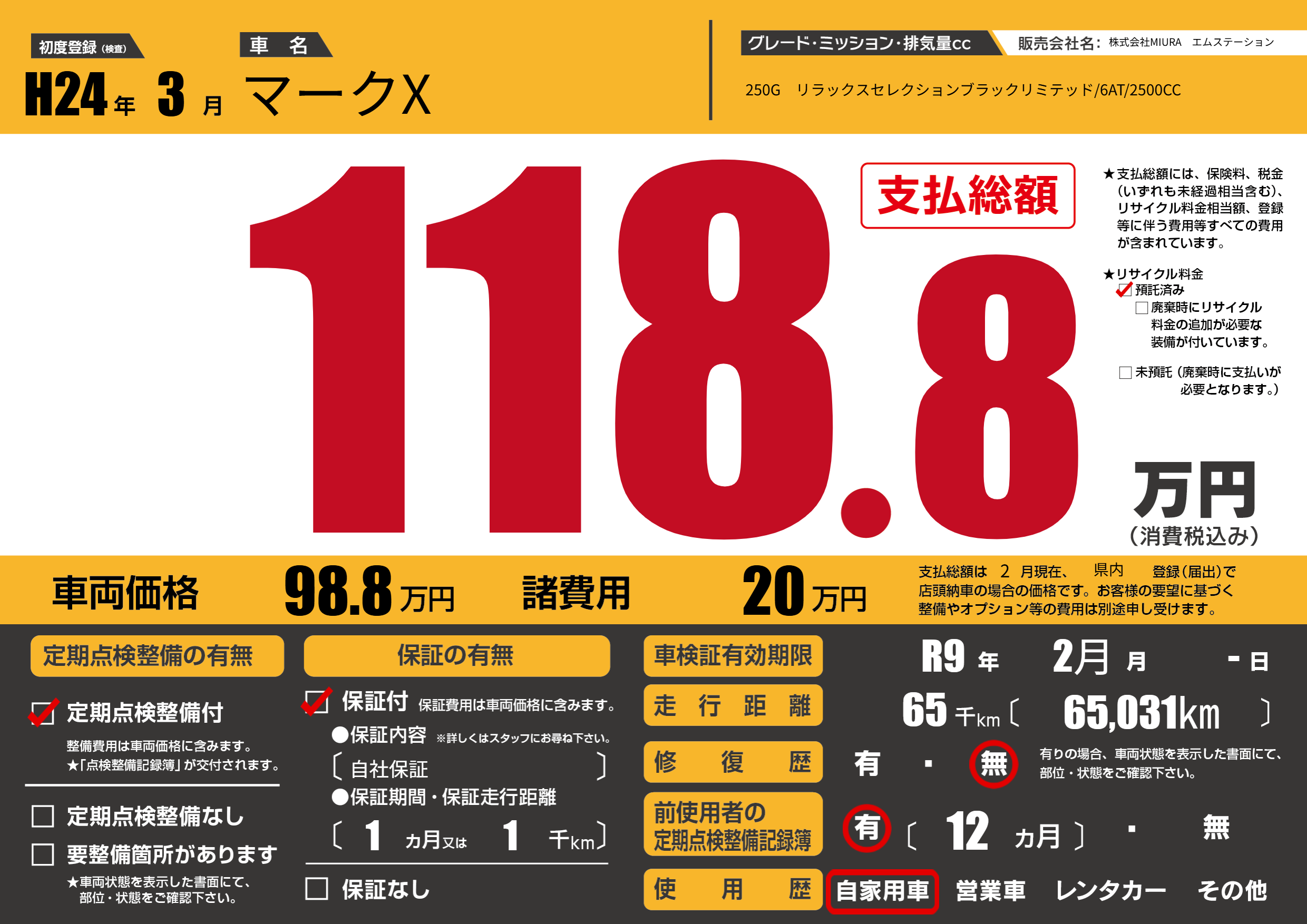 | 走行キロ | 6.5万km | 初年度登録 | H24年3月 |