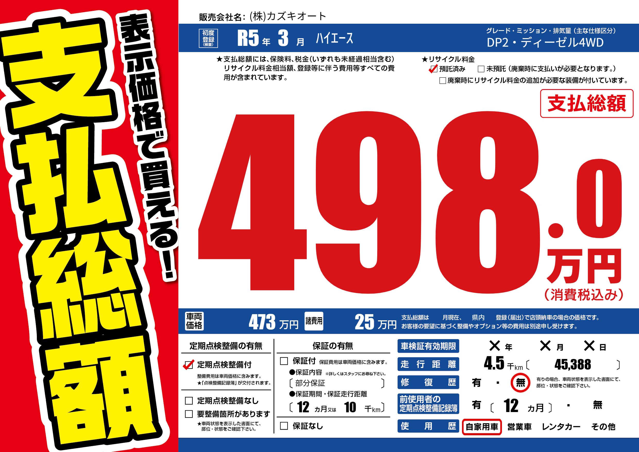| 車名 | ハイエース | グレード ミッション 排気量 |