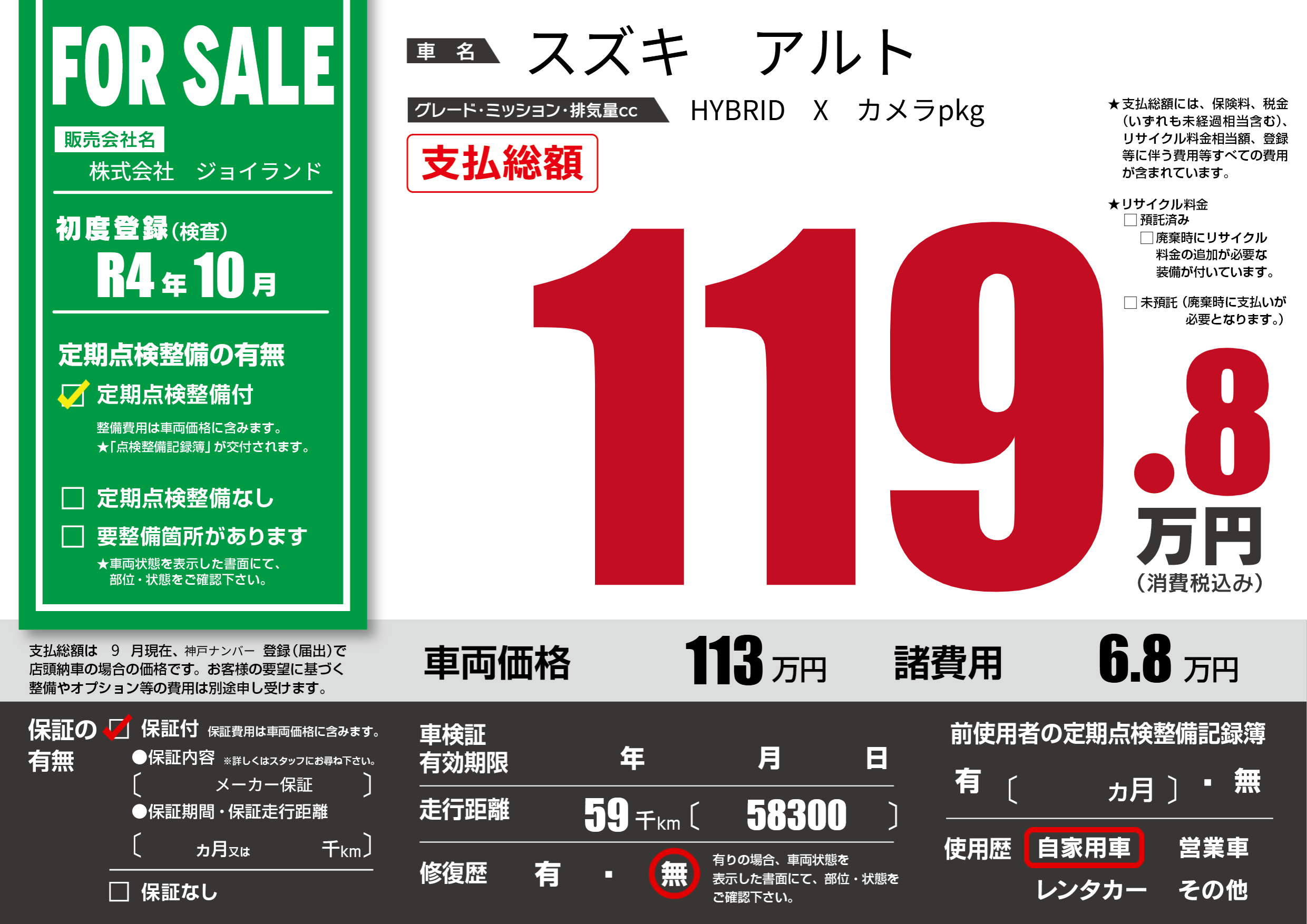 | 車名 | スズキ アルト | グレード ミッション 排気量 |