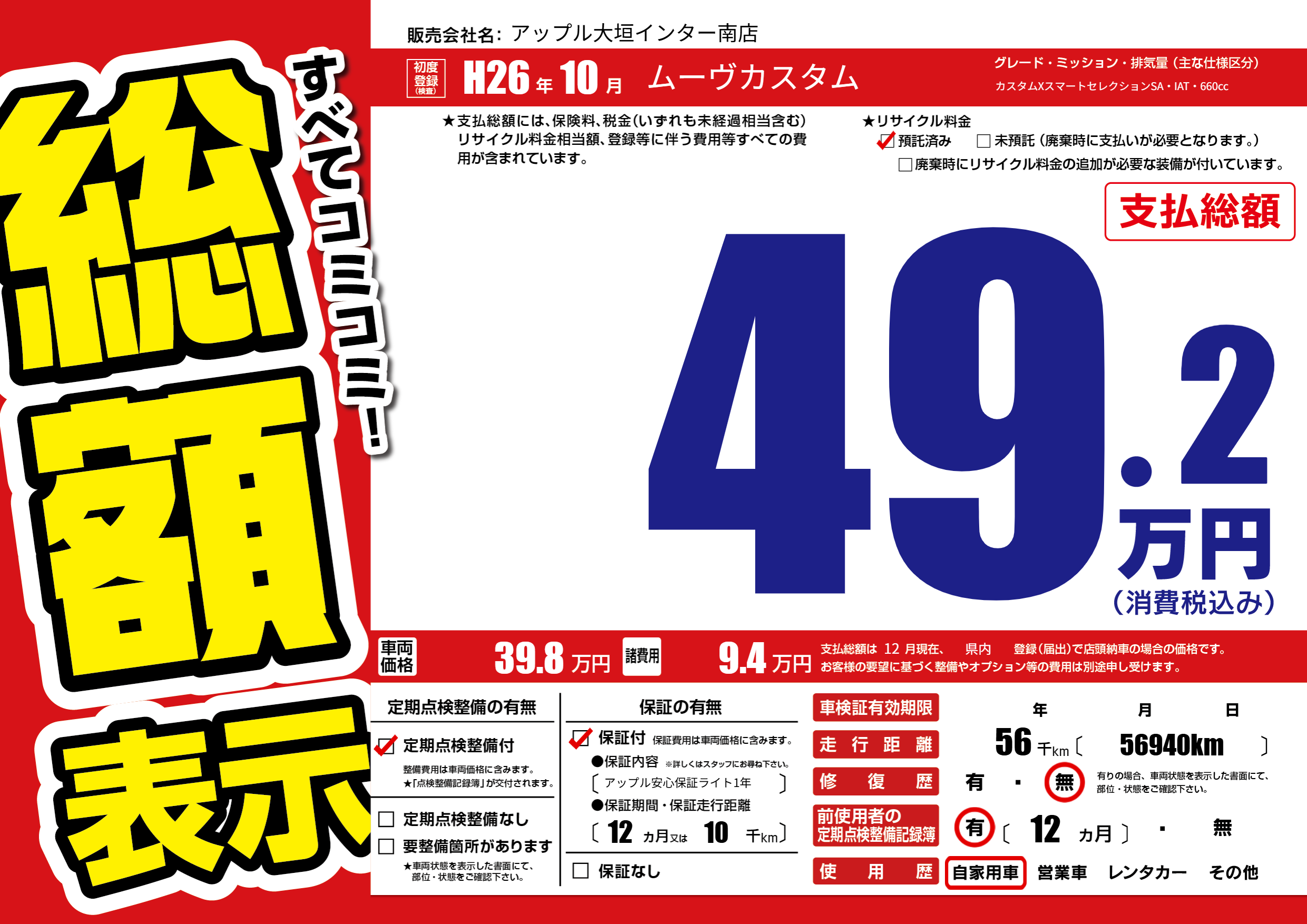 | 走行キロ | 5.6万km | 初年度登録 | H26年10月 |