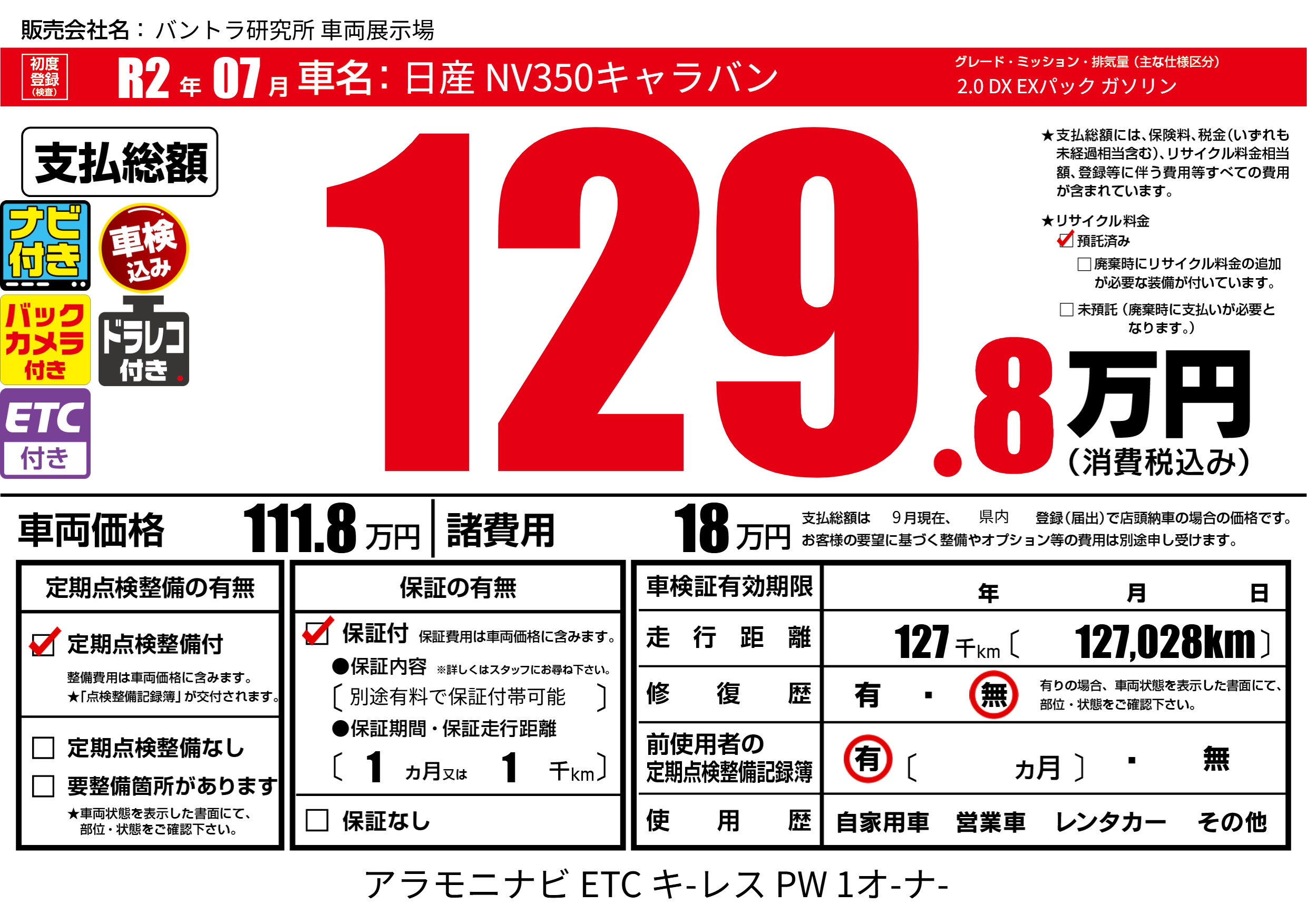 | 走行キロ | 12.7万km | 初年度登録 | R2年07月 |