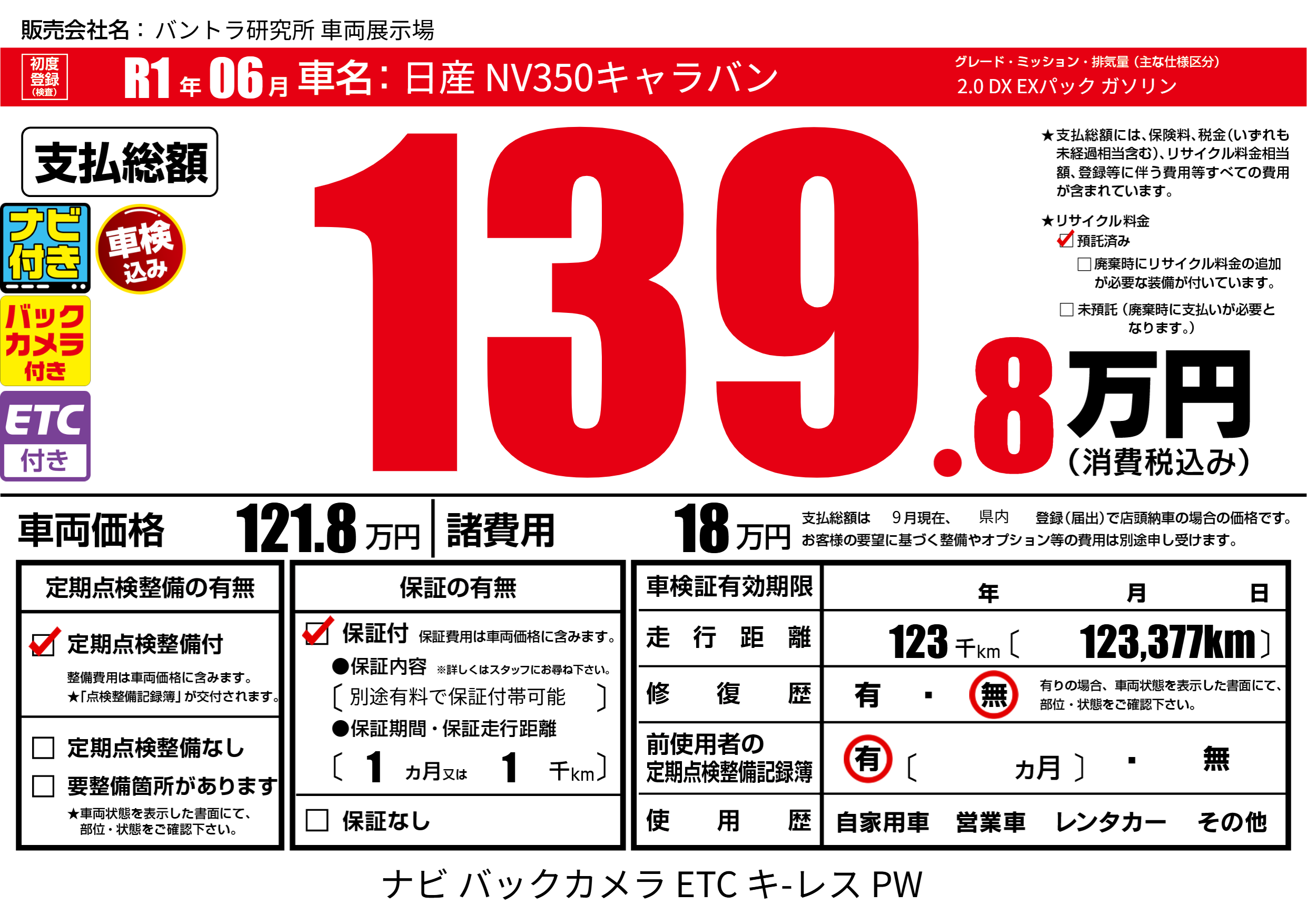 | 走行キロ | 12.3万km | 初年度登録 | R1年06月 |