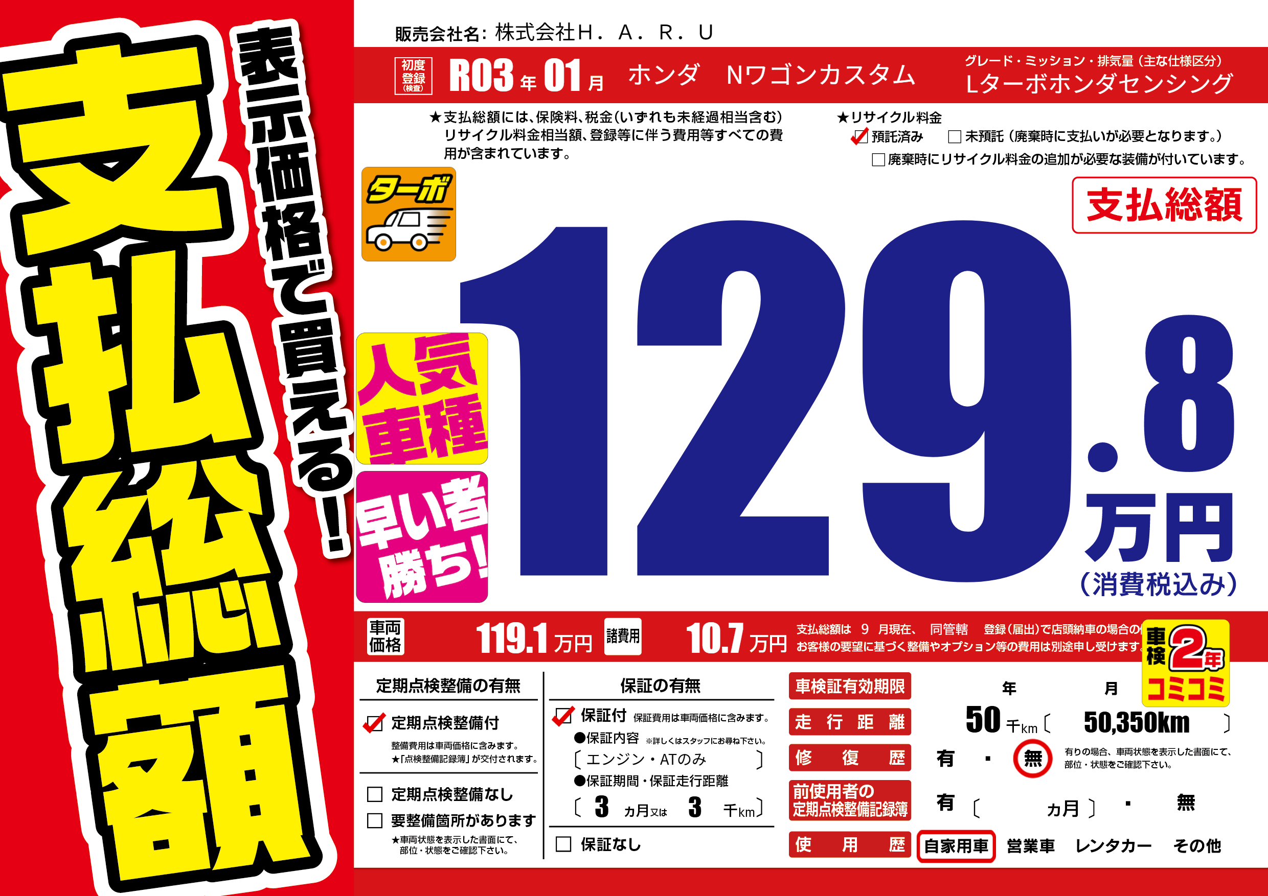 | 走行キロ | 5万km | 初年度登録 | R03年01月 |