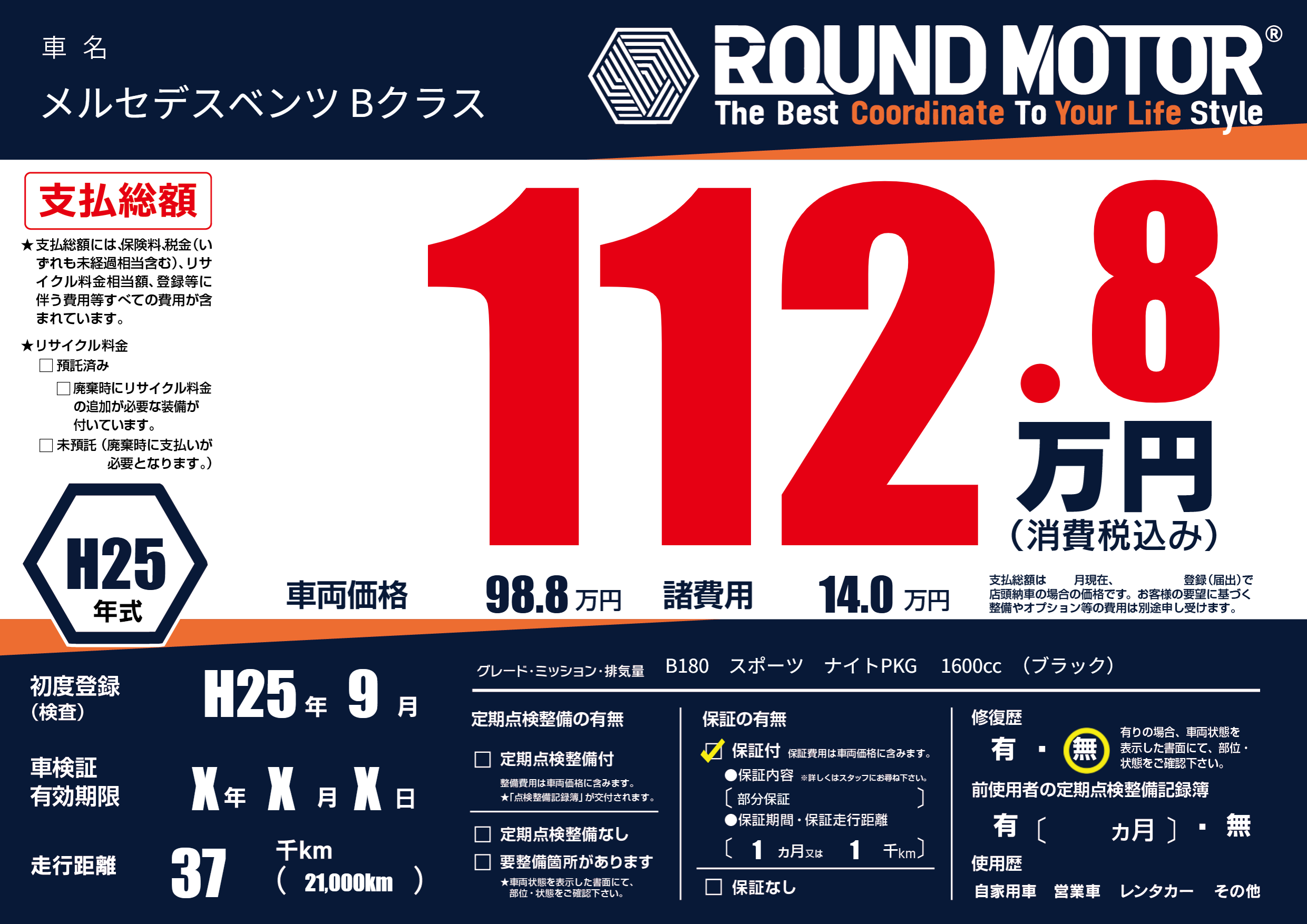 | 車名 | メルセデスベンツ Bクラス | グレード ミッション 排気量 |