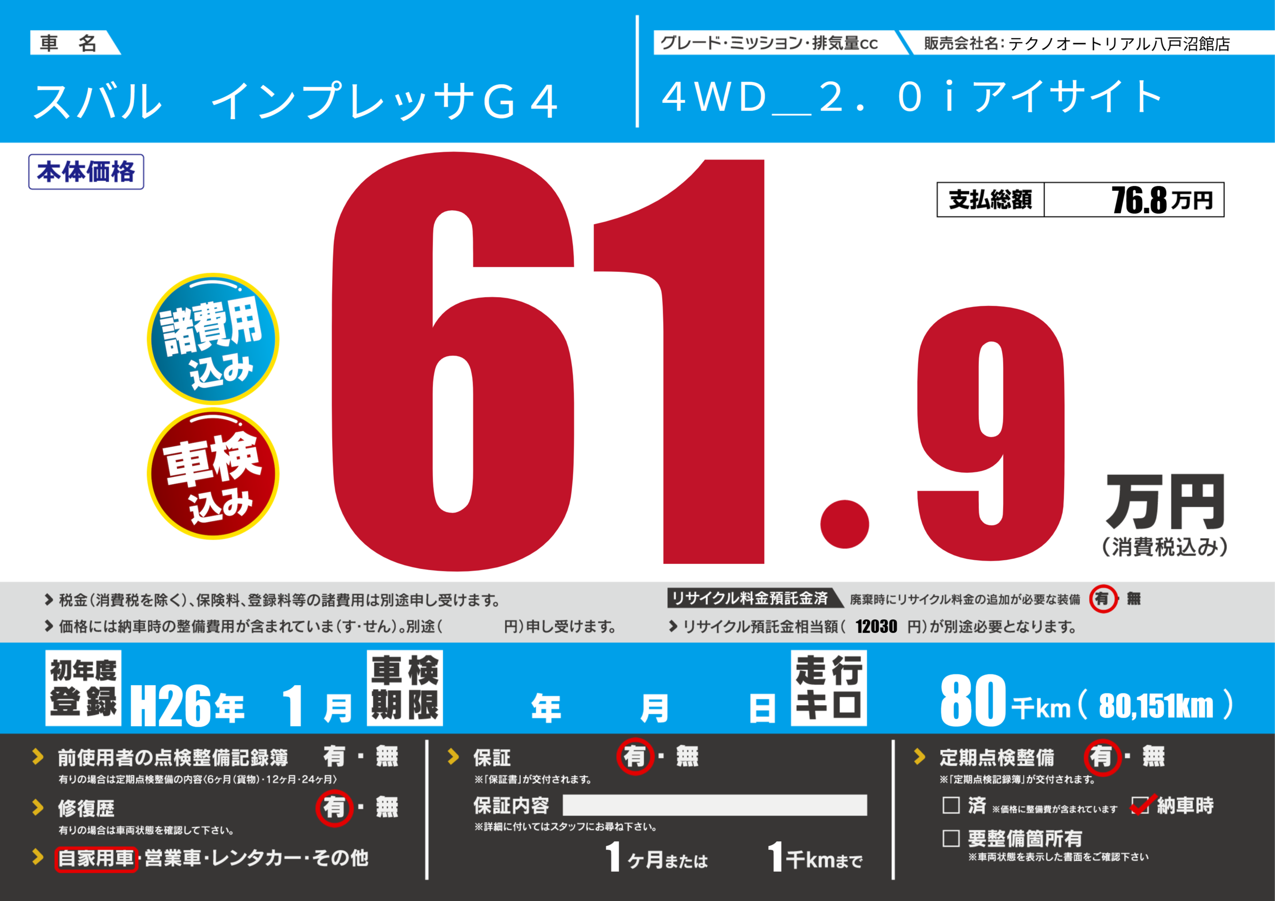 | 走行キロ | 8万km | 初年度登録 | H26年1月 |