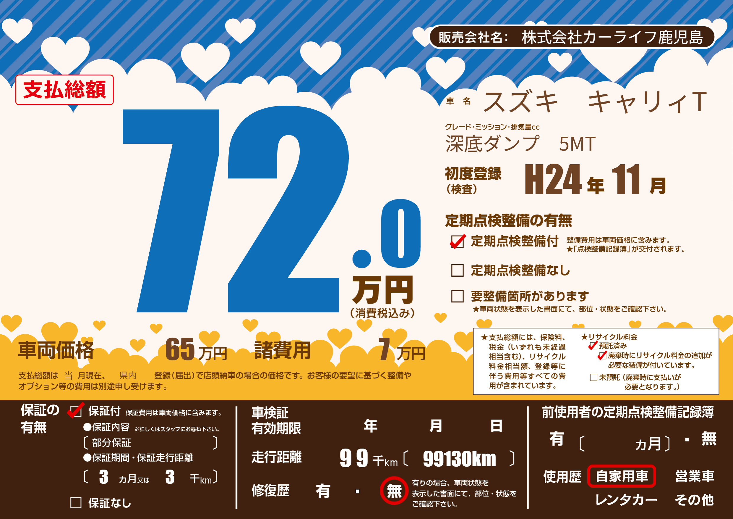 | 走行キロ | 0.9万km | 初年度登録 | H24年11月 |