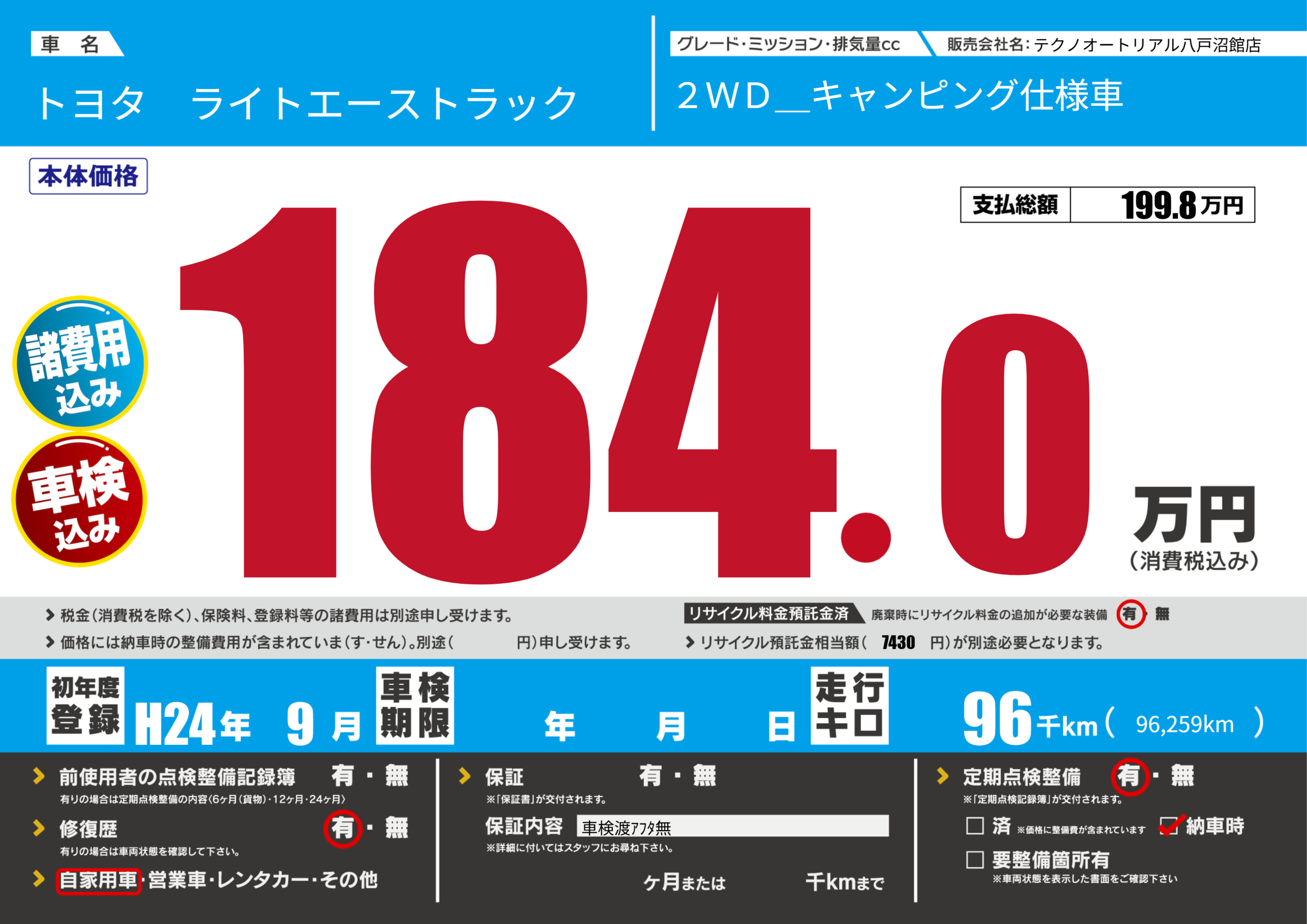 | 定期点検整備 | 定期点検整備あり 納車時あり | ||