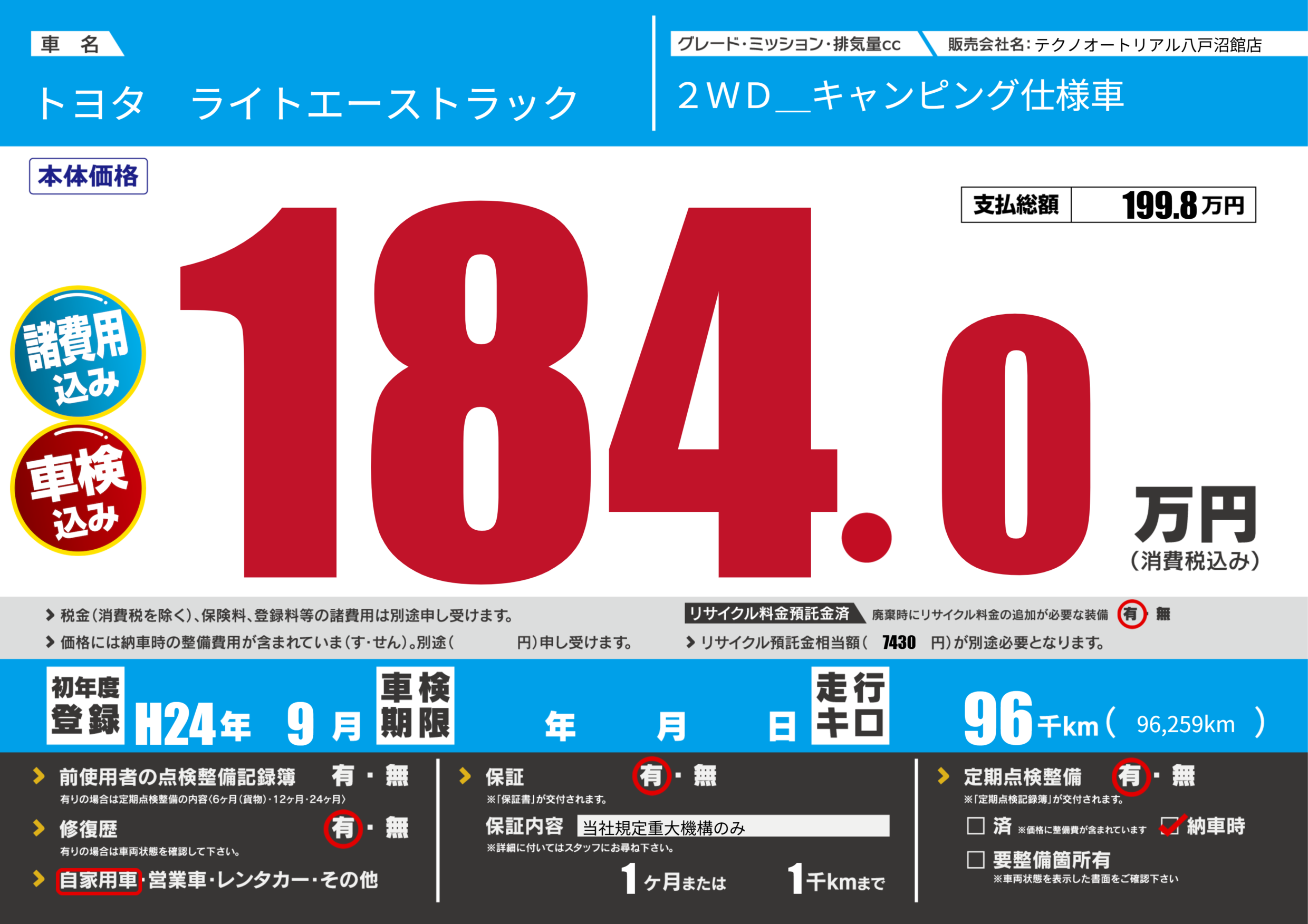 | 定期点検整備 | 定期点検整備あり 納車時あり | ||
