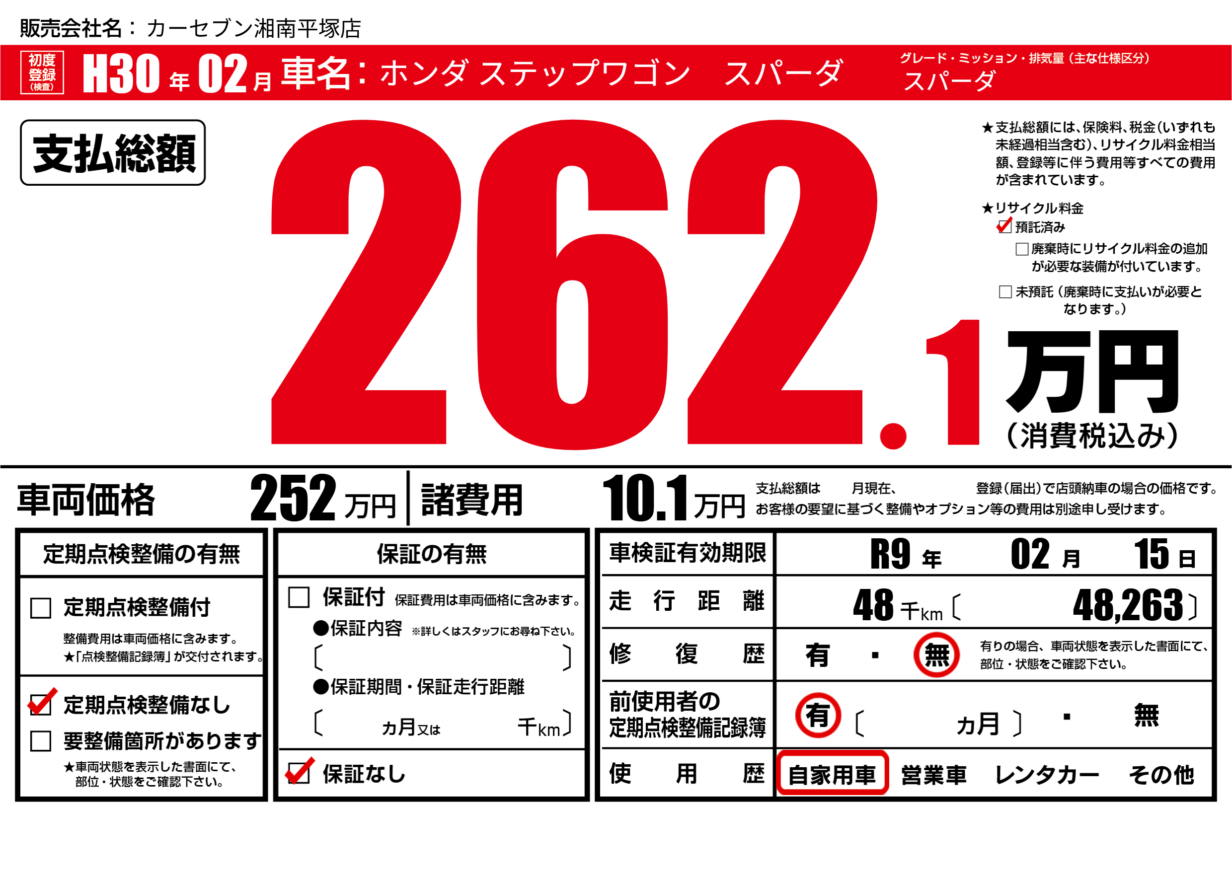 | 車名 | ホンダ ステップワゴン スパーダ | グレード ミッション 排気量 |