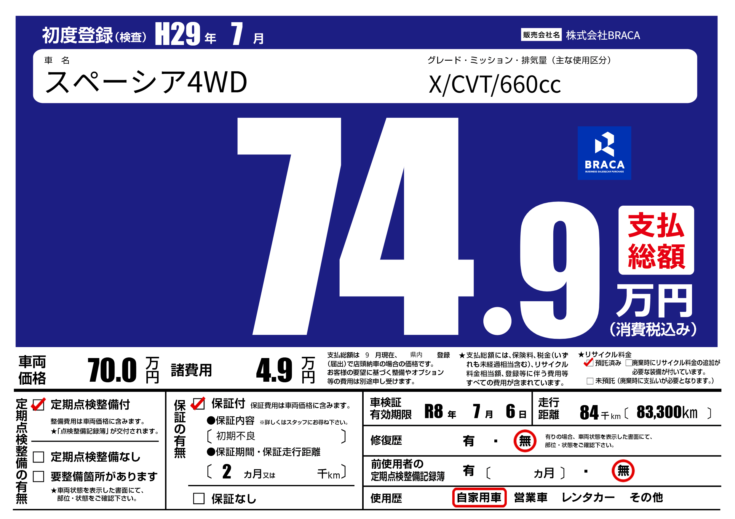 | 車名 | スペーシア4WD | グレード ミッション 排気量 |