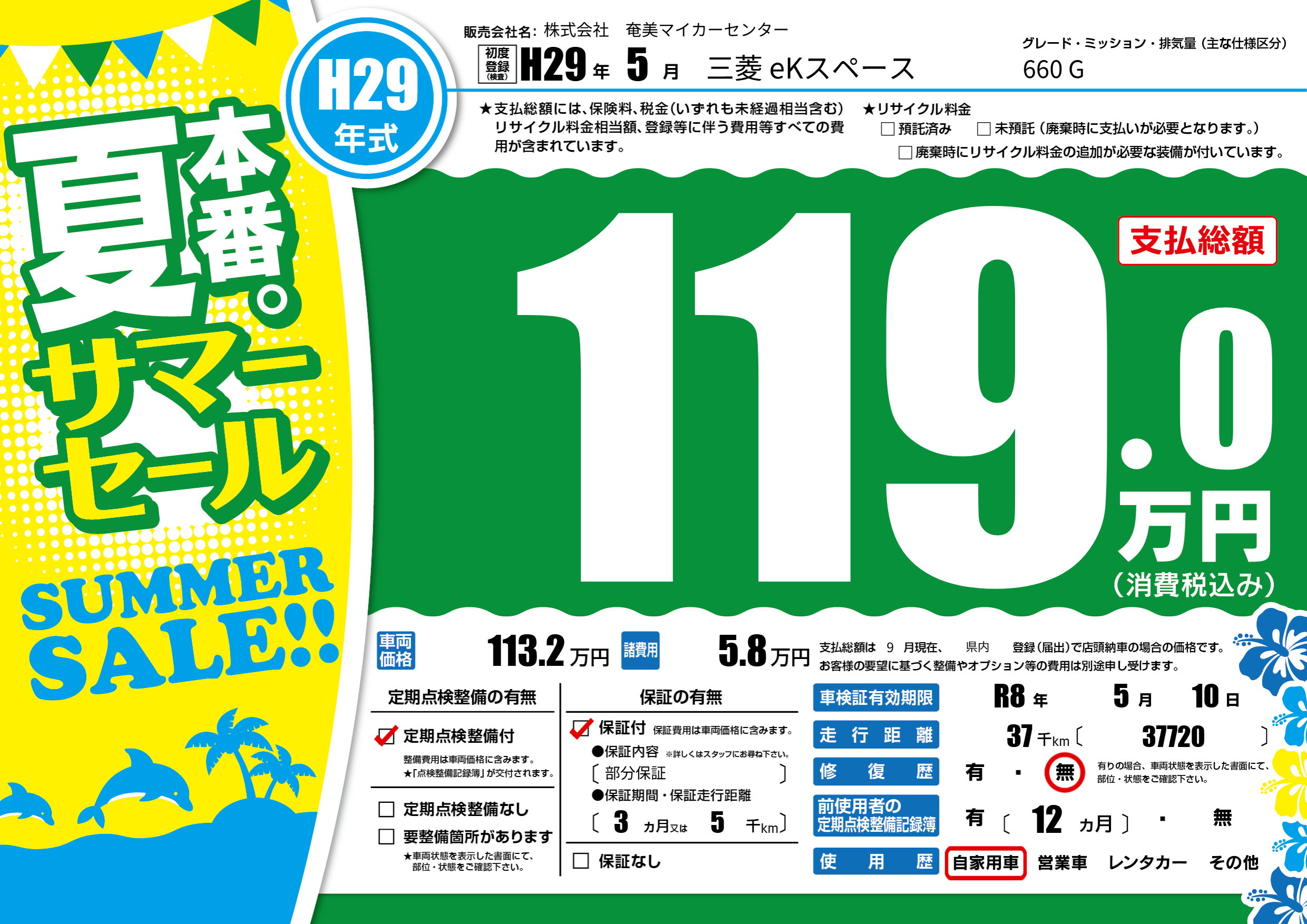 | 走行キロ | 3.7万km | 初年度登録 | H29年5月 |