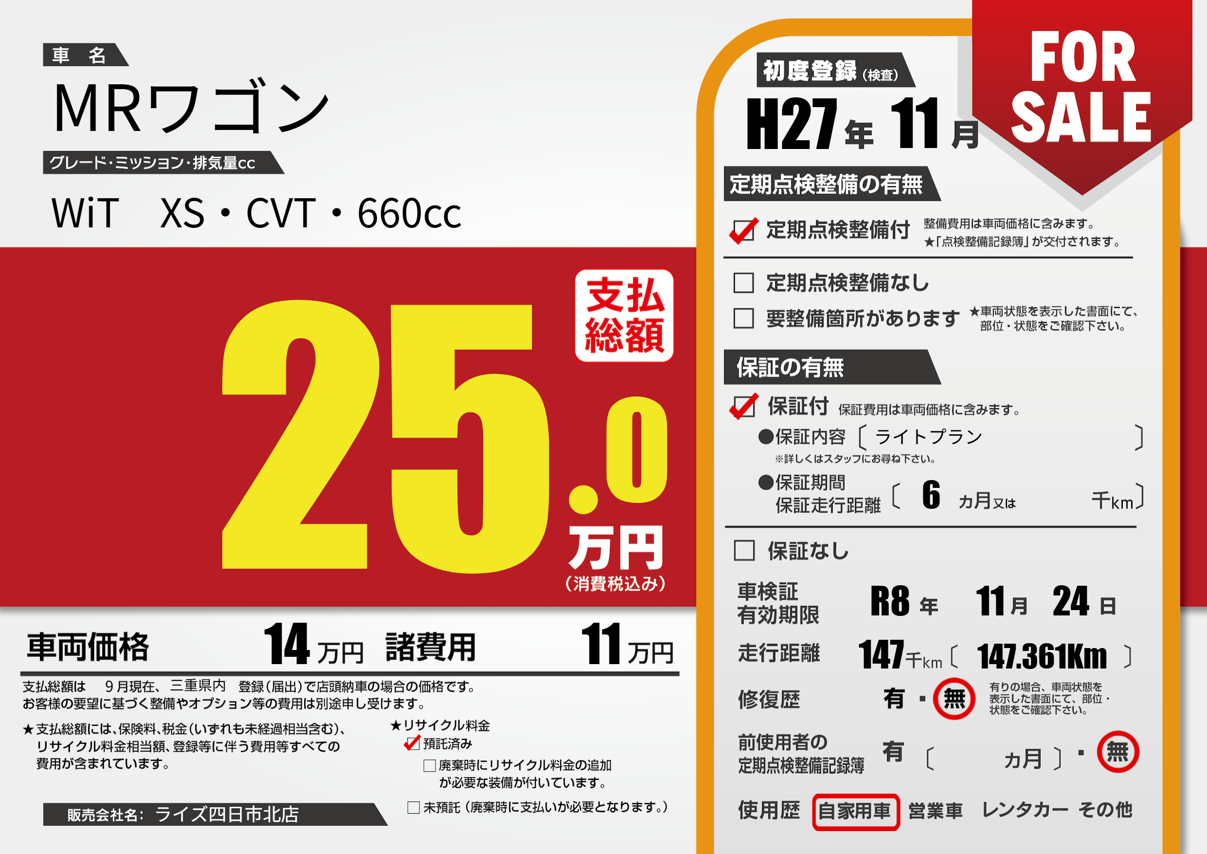 | 車名 | MRワゴン | グレード ミッション 排気量 |