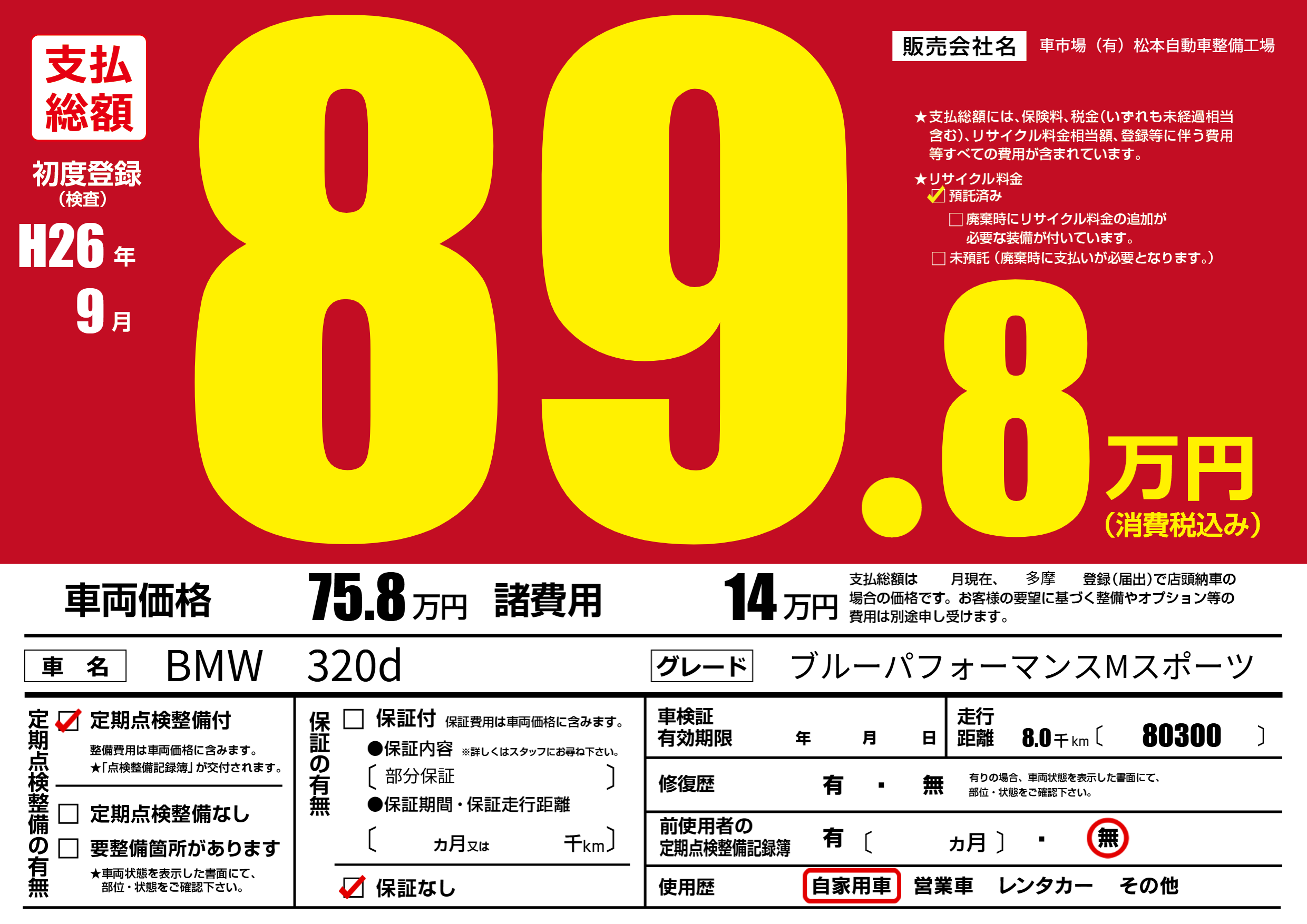 | 車名 | BMW 320d | グレード ミッション 排気量 |
