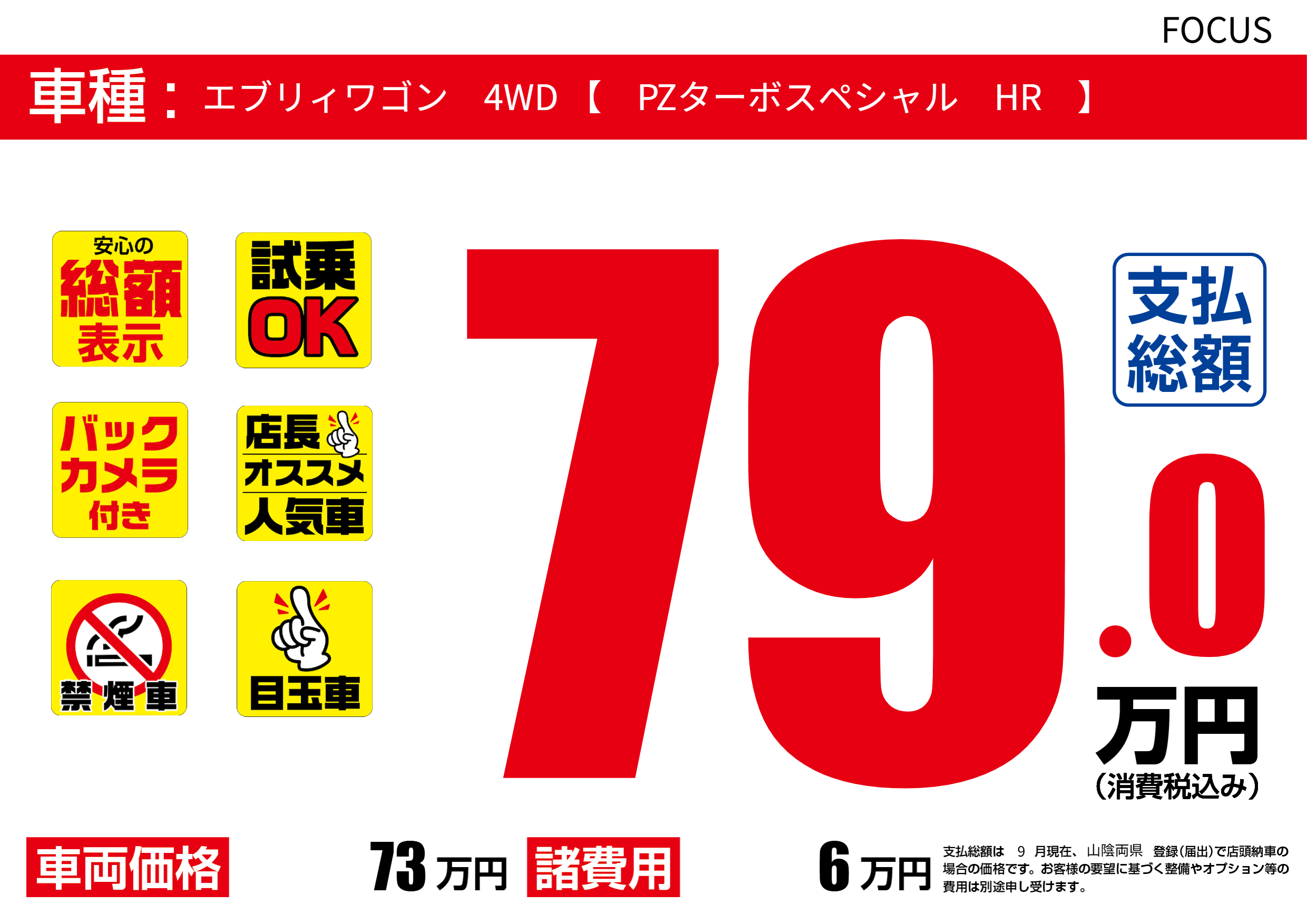 | 車名 | エブリィワゴン 4WD 【 PZターボスペシャル HR 】 | グレード ミッション 排気量 |