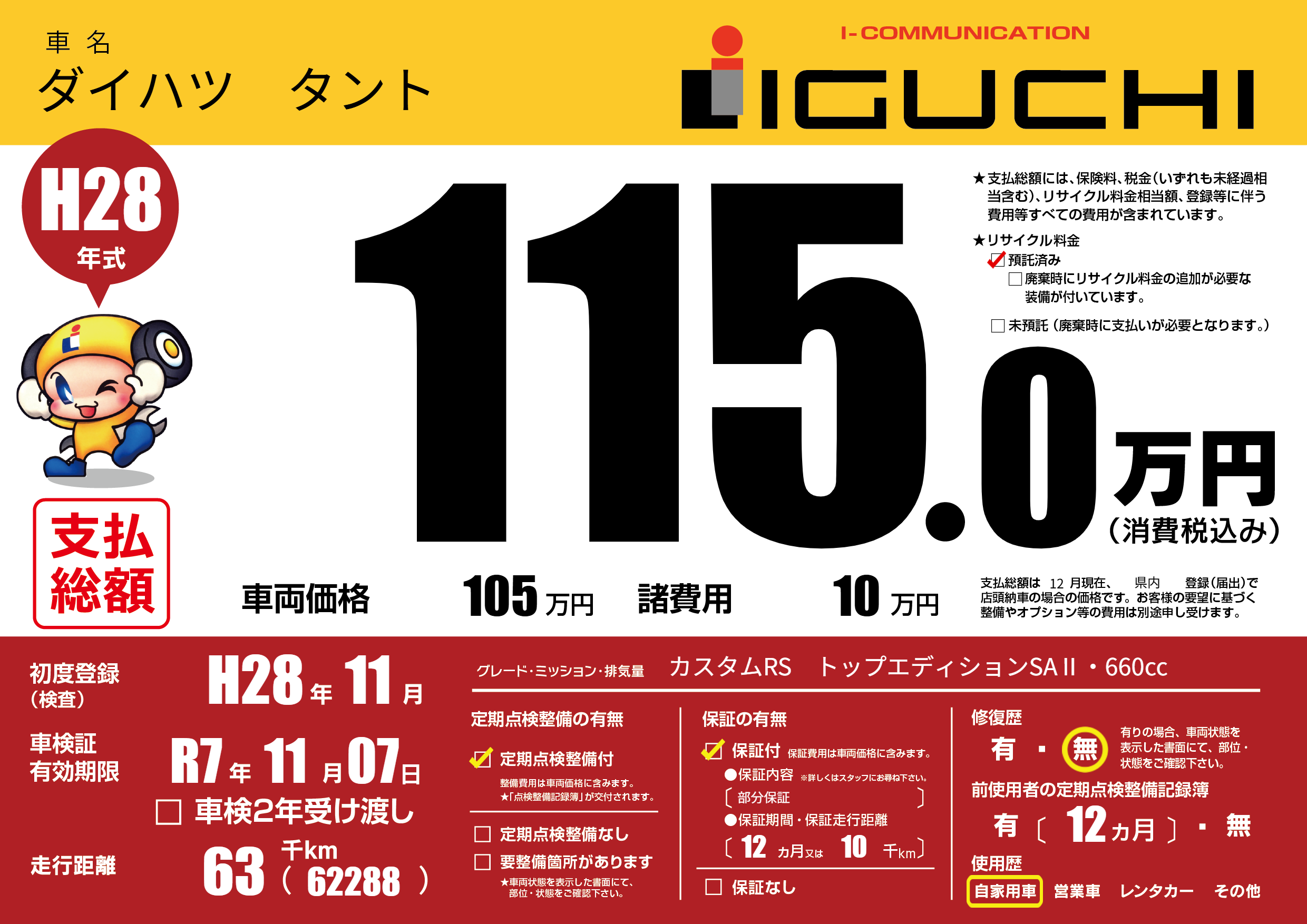 | 走行キロ | 6.3万km | 初年度登録 | H28年11月 |