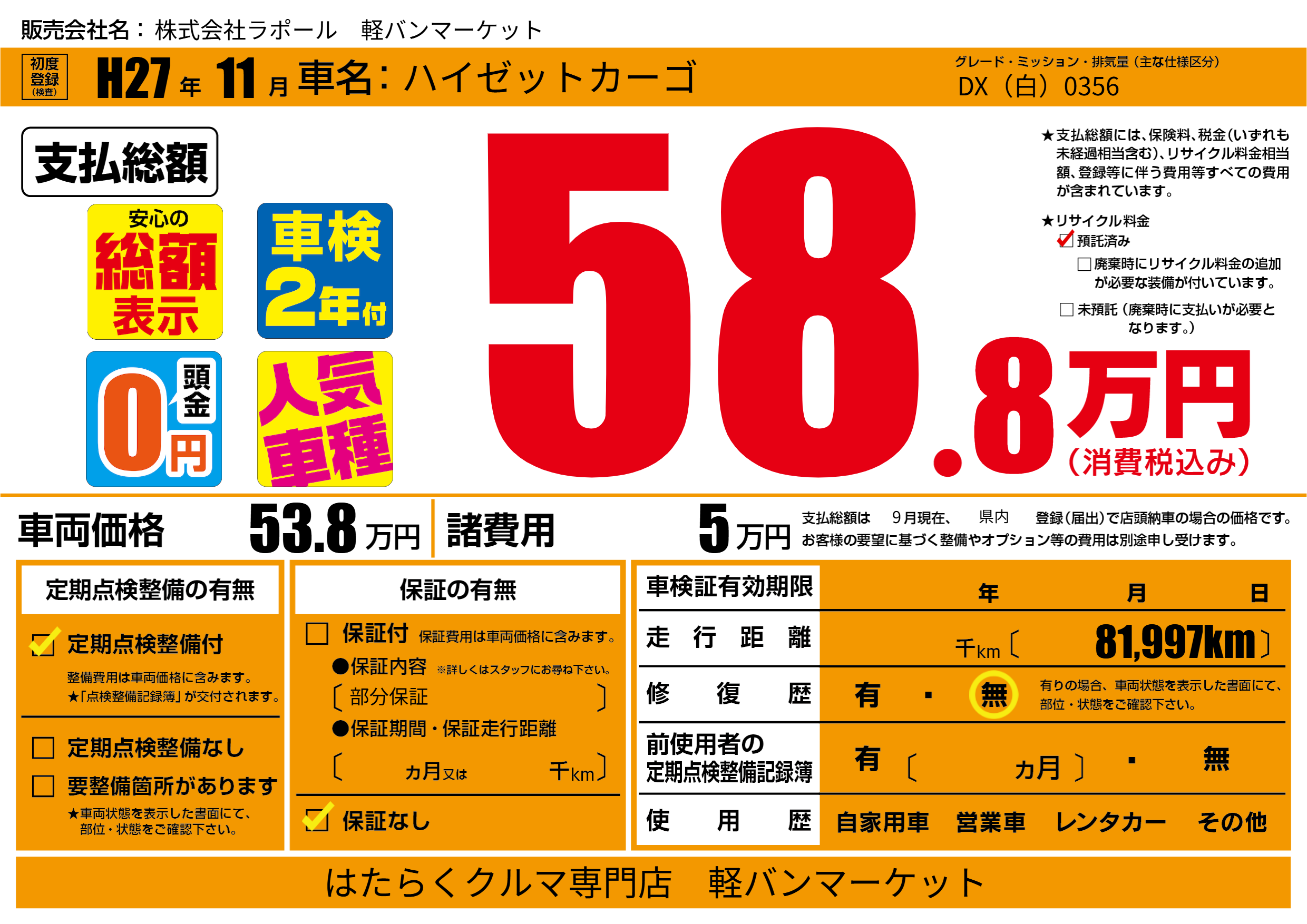 保証なし 保証内容(部分保証) ---ヶ月または()千kmまで |