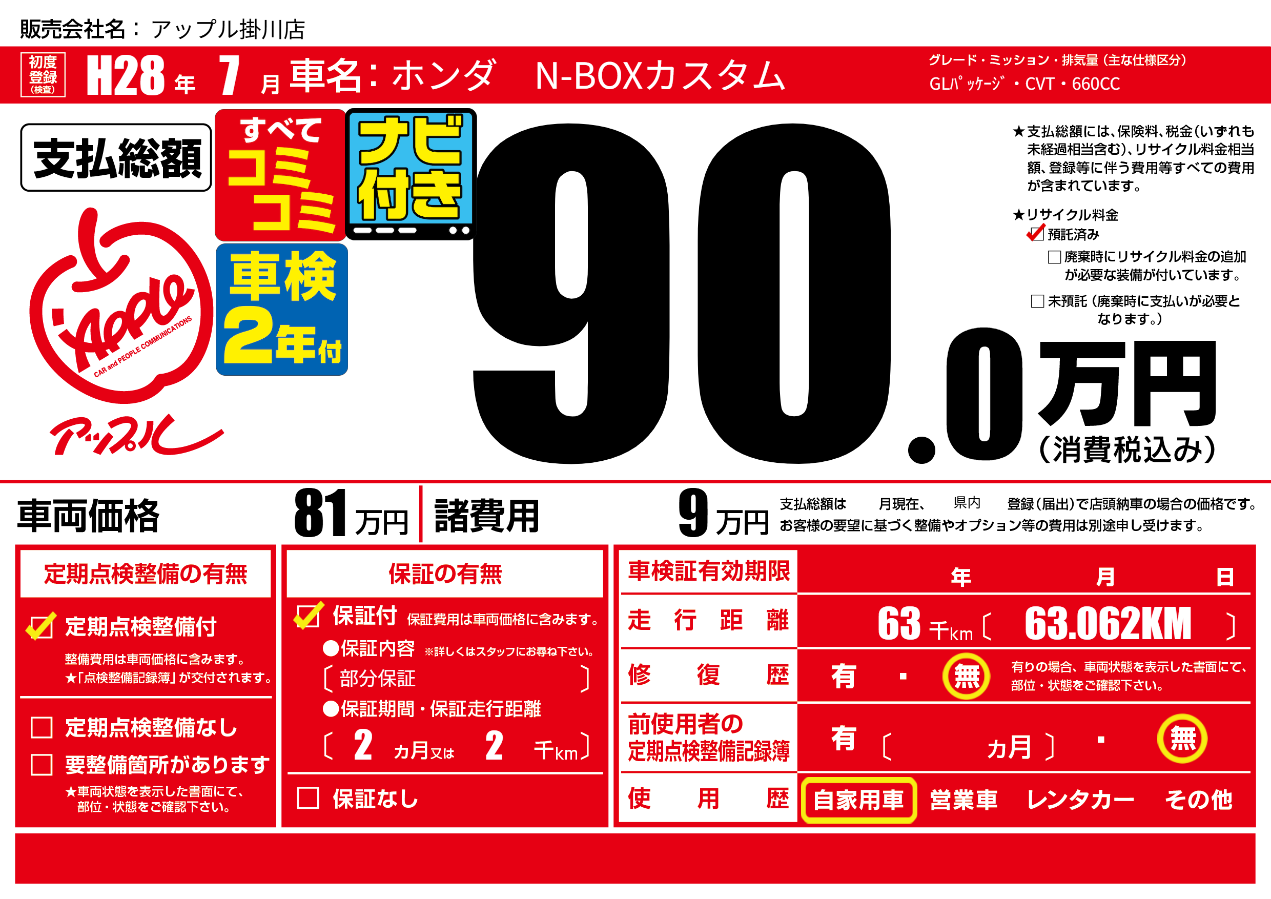 | 車名 | ホンダ N-BOXカスタム | グレード ミッション 排気量 |