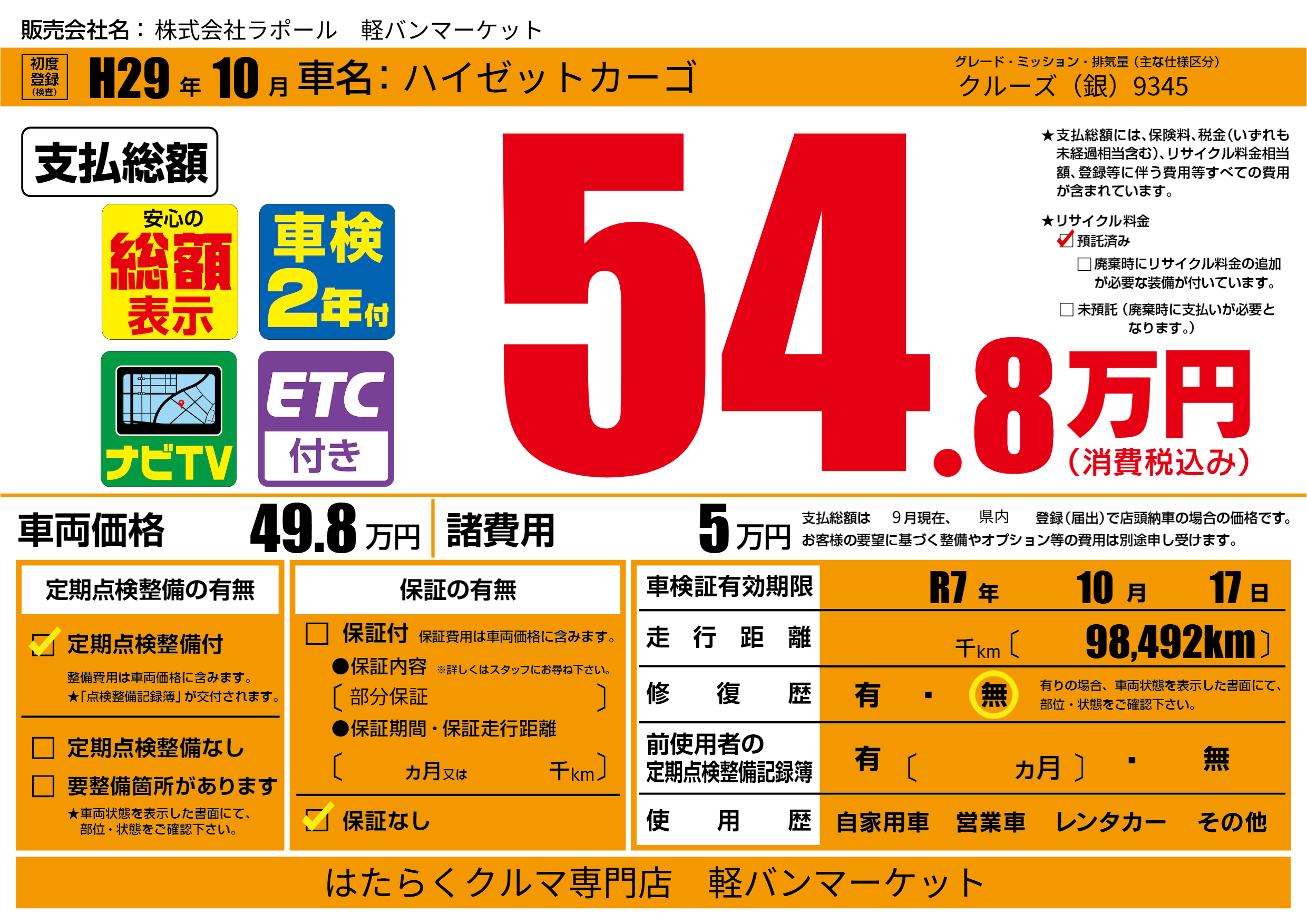なし | 車検制限 | R7年10月17月 |