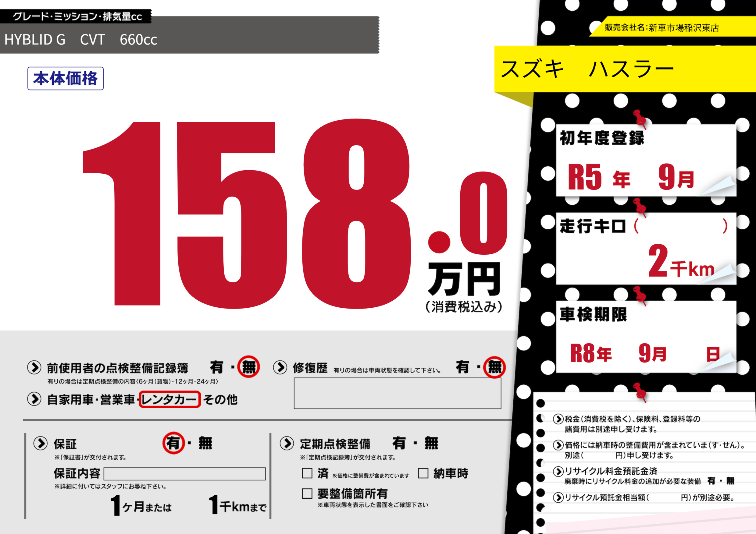 | 走行キロ | 0.2万km | 初年度登録 | R5年9月 |