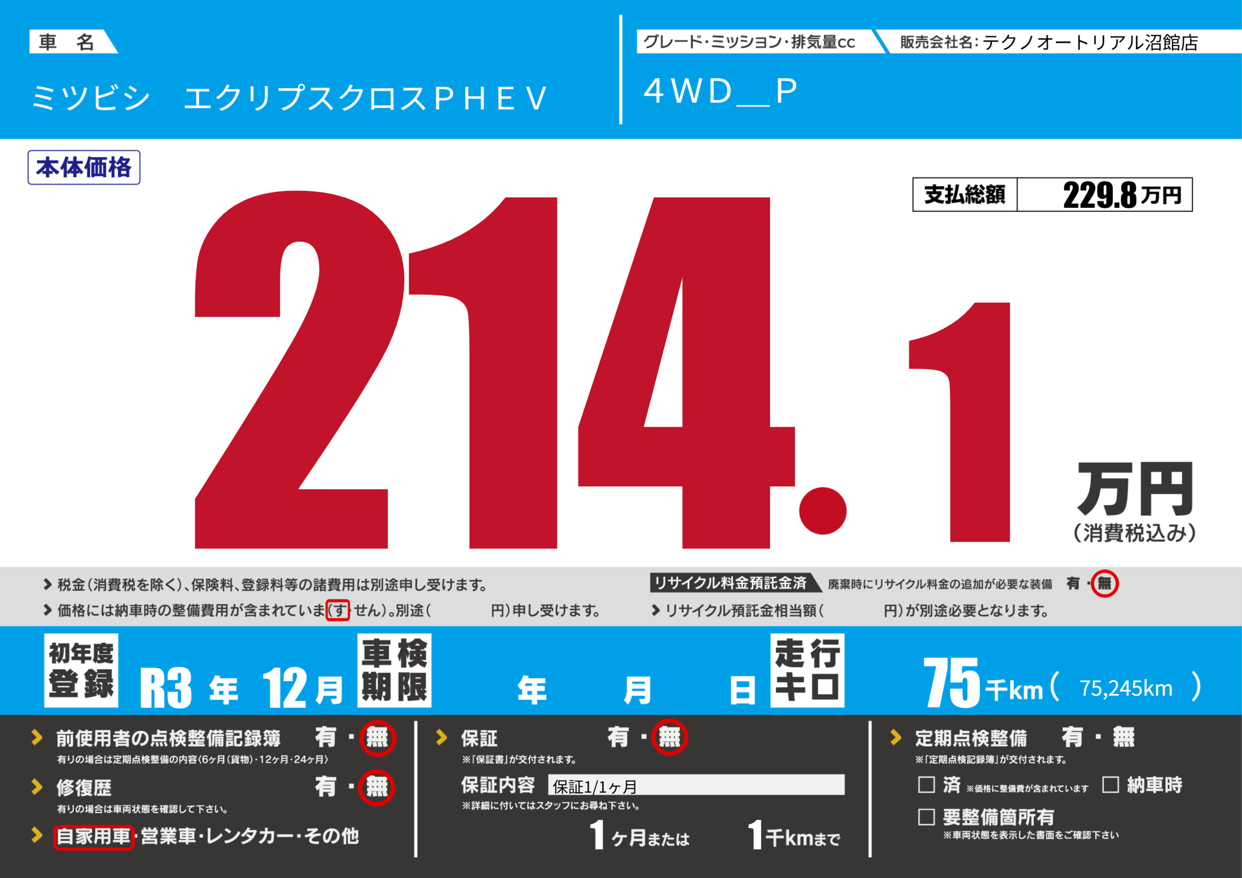| 走行キロ | 7.5万km | 初年度登録 | R3年12月 |