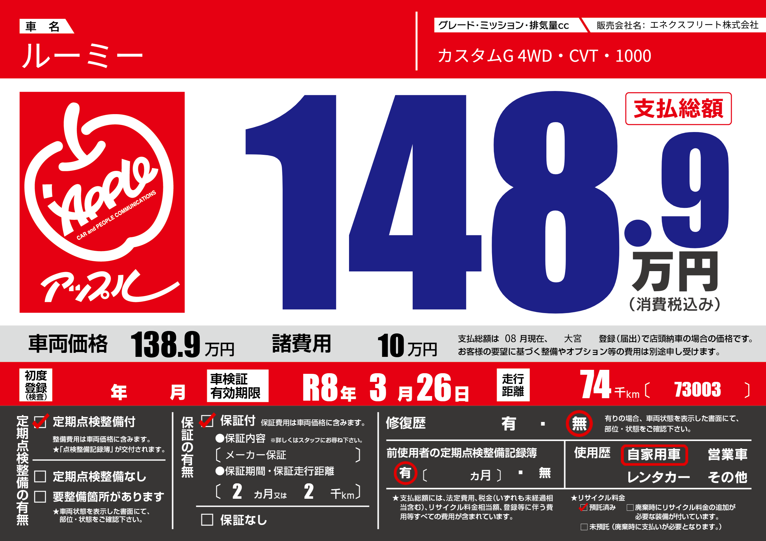 | 車名 | ルーミー | グレード ミッション 排気量 |