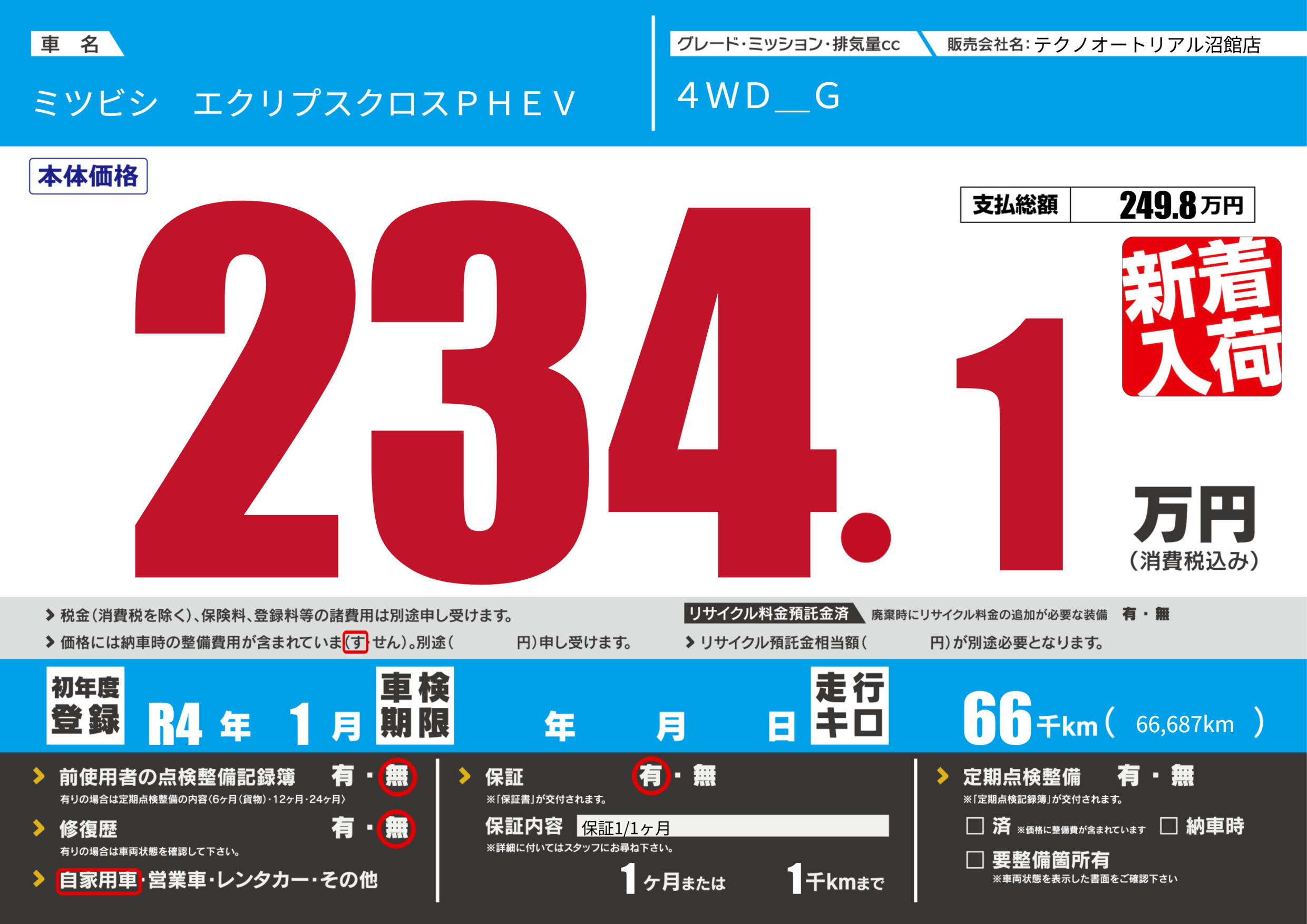 | 車名 | ミツビシ エクリプスクロスPHEV | グレード ミッション 排気量 |