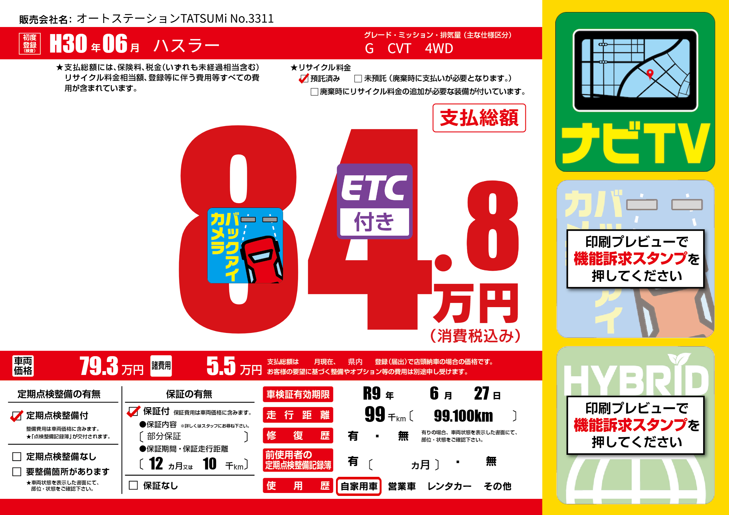 | 走行キロ | 9.9万km | 初年度登録 | H30年06月 |