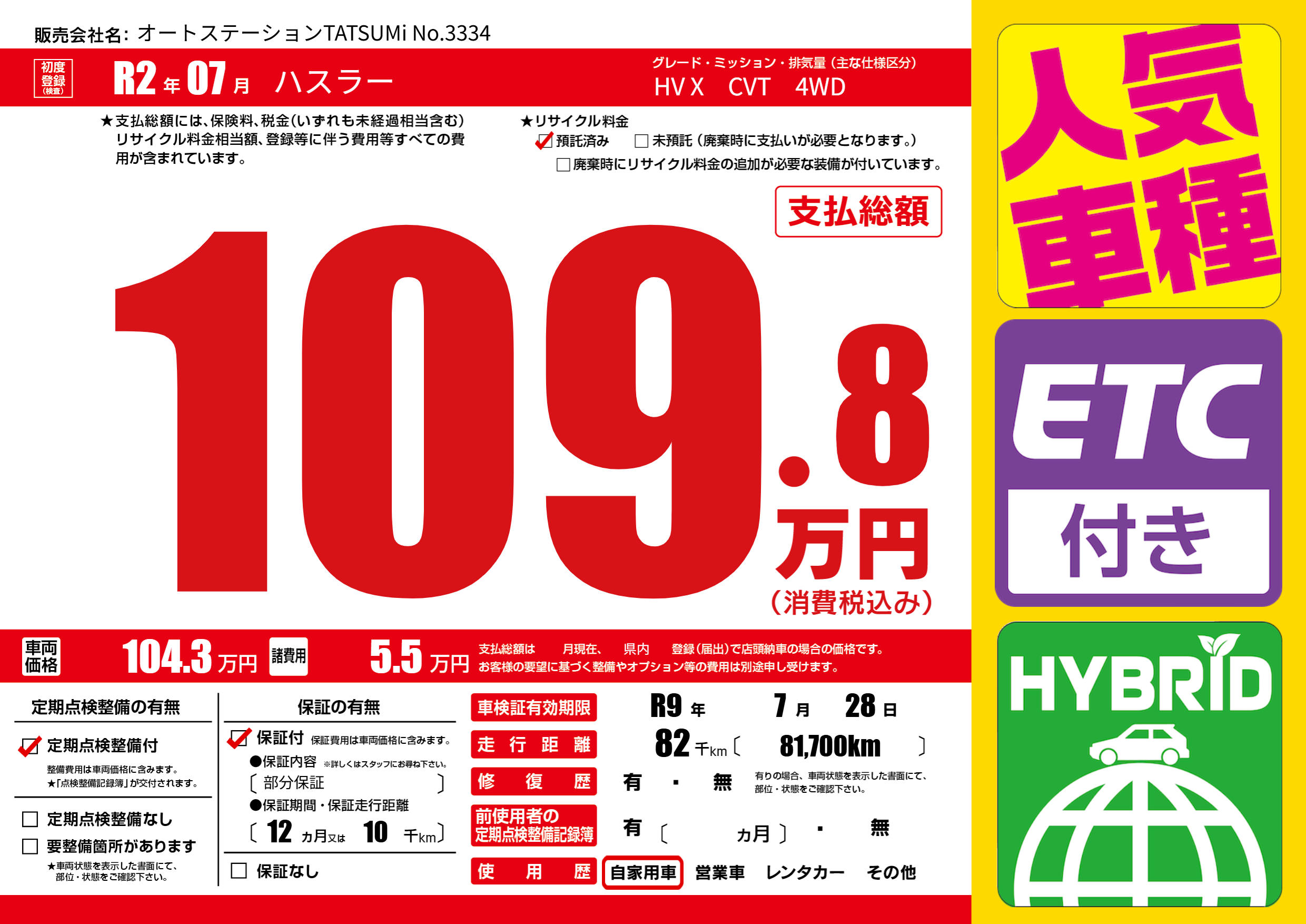 | 車名 | ハスラー | グレード ミッション 排気量 |