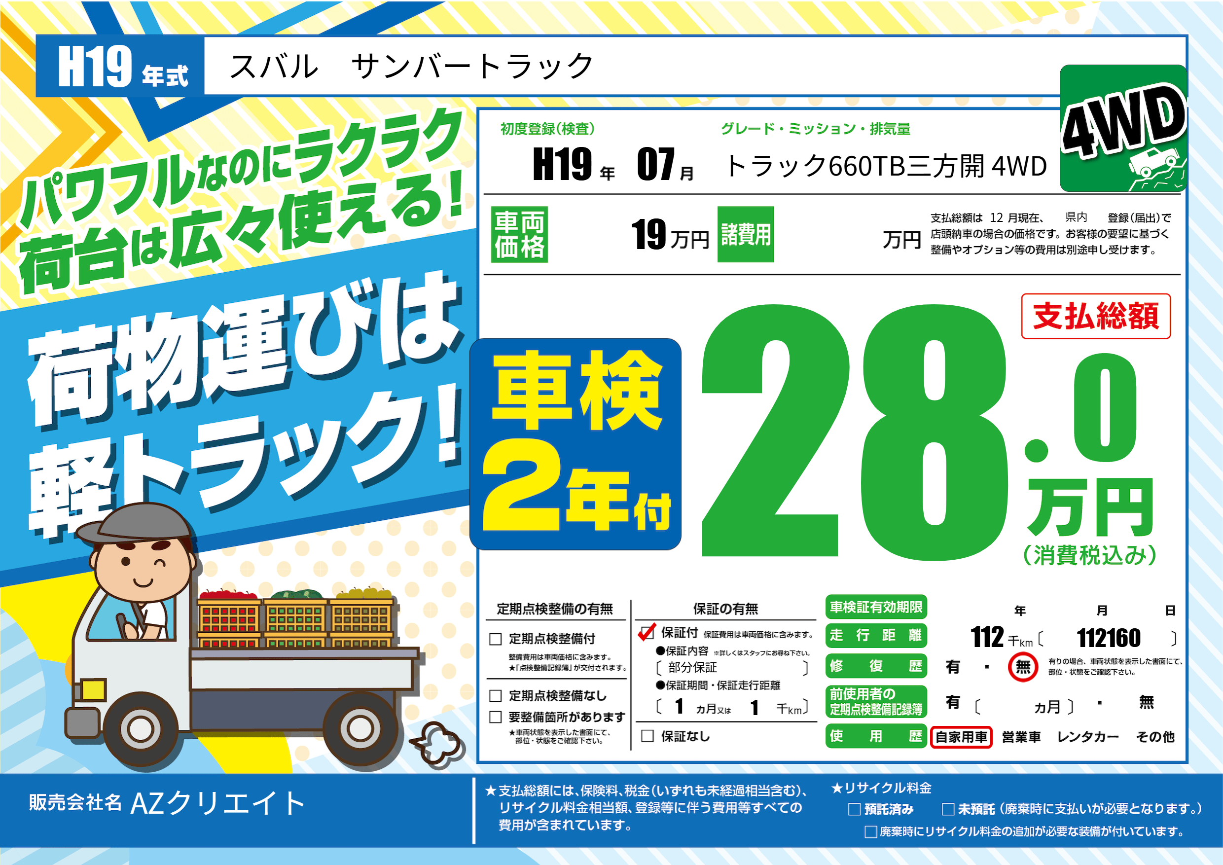 | 車名 | スバル サンバートラック | グレード ミッション 排気量 |
