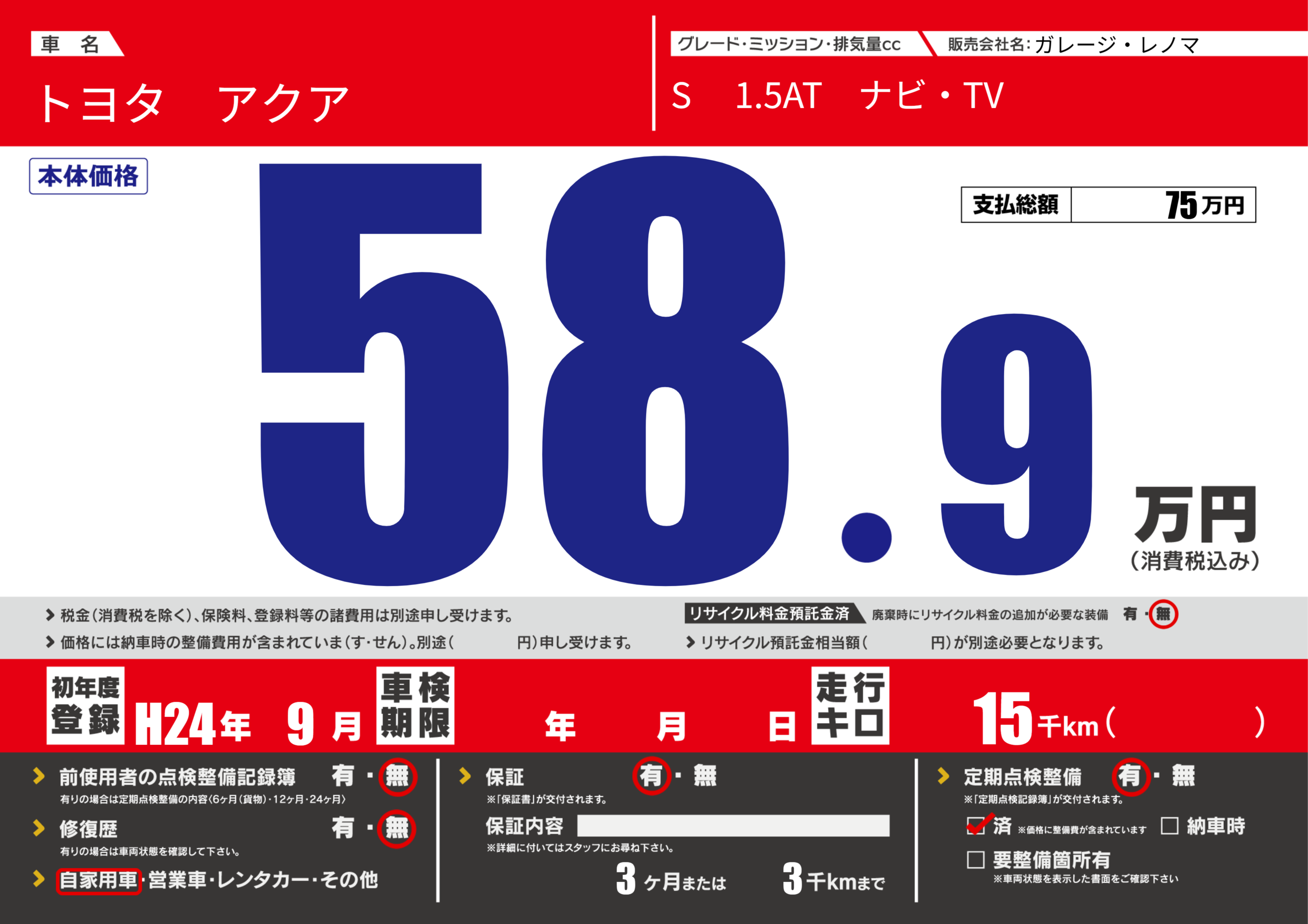 | 定期点検整備 | 定期点検整備あり 定期点検整備済み | ||
