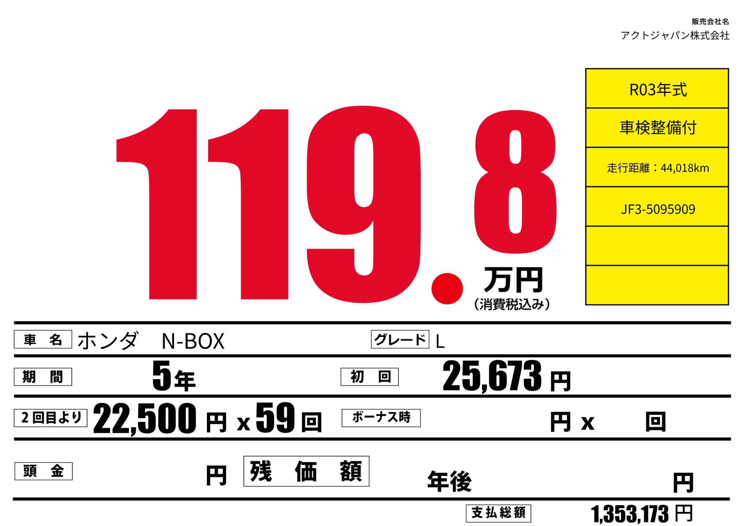| 車名 | ホンダ N-BOX | グレード ミッション 排気量 |