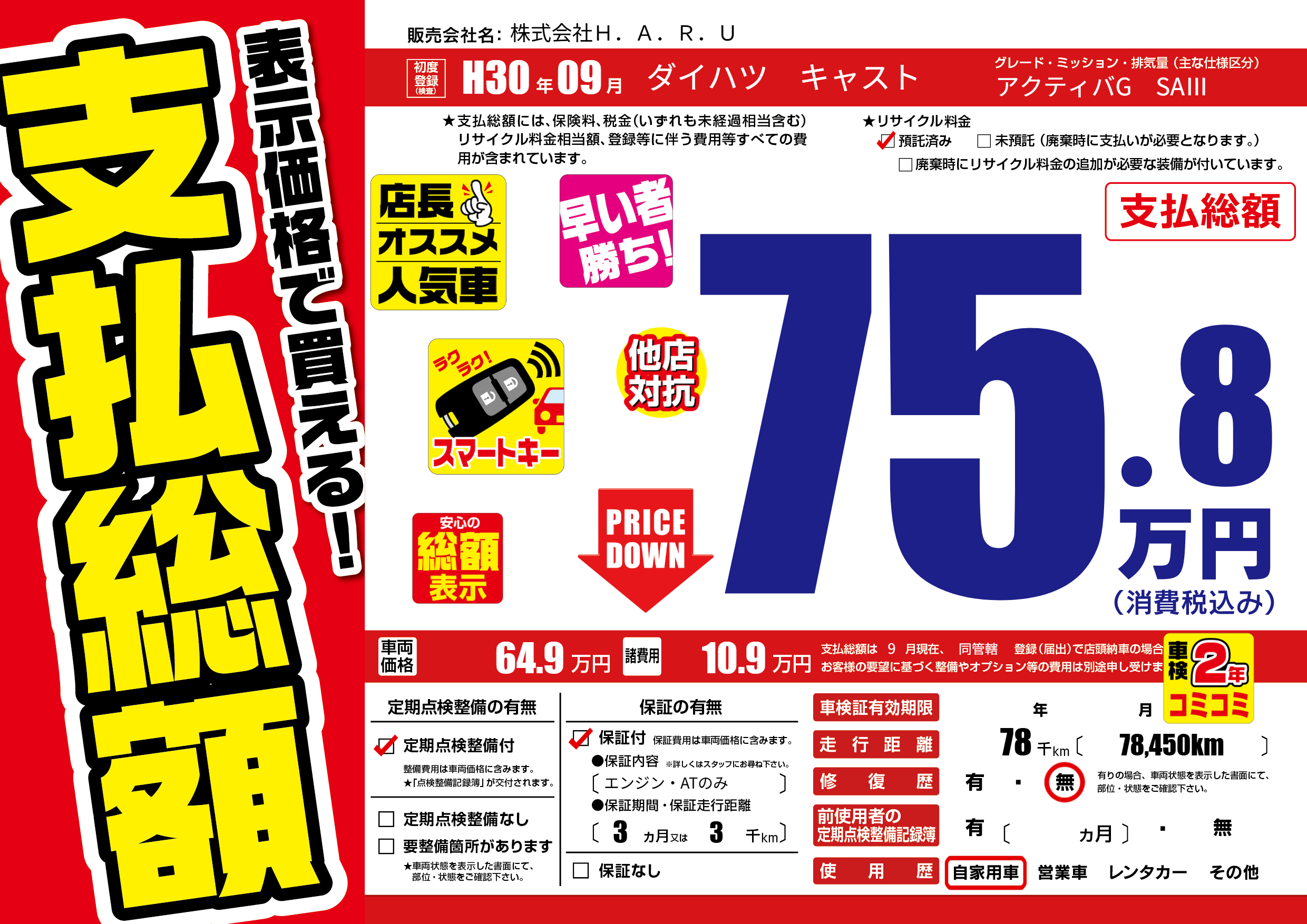 | 走行キロ | 7.8万km | 初年度登録 | H30年09月 |