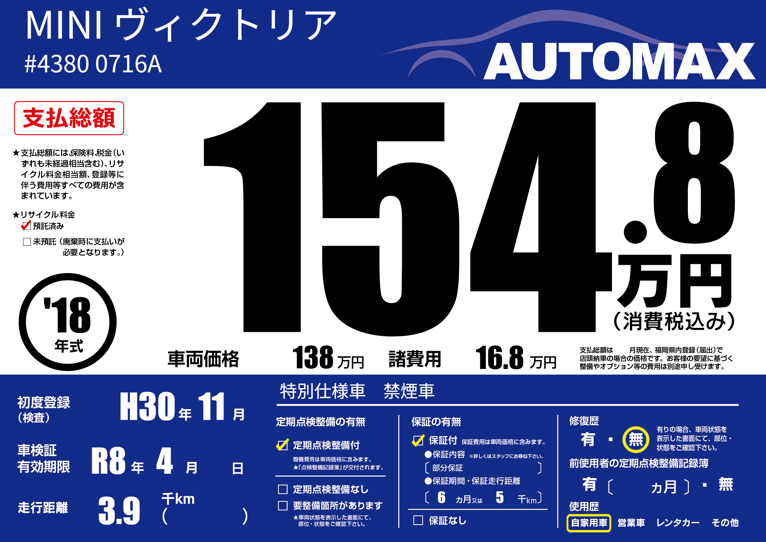 | 車名 | MINI ヴィクトリア | グレード ミッション 排気量 |