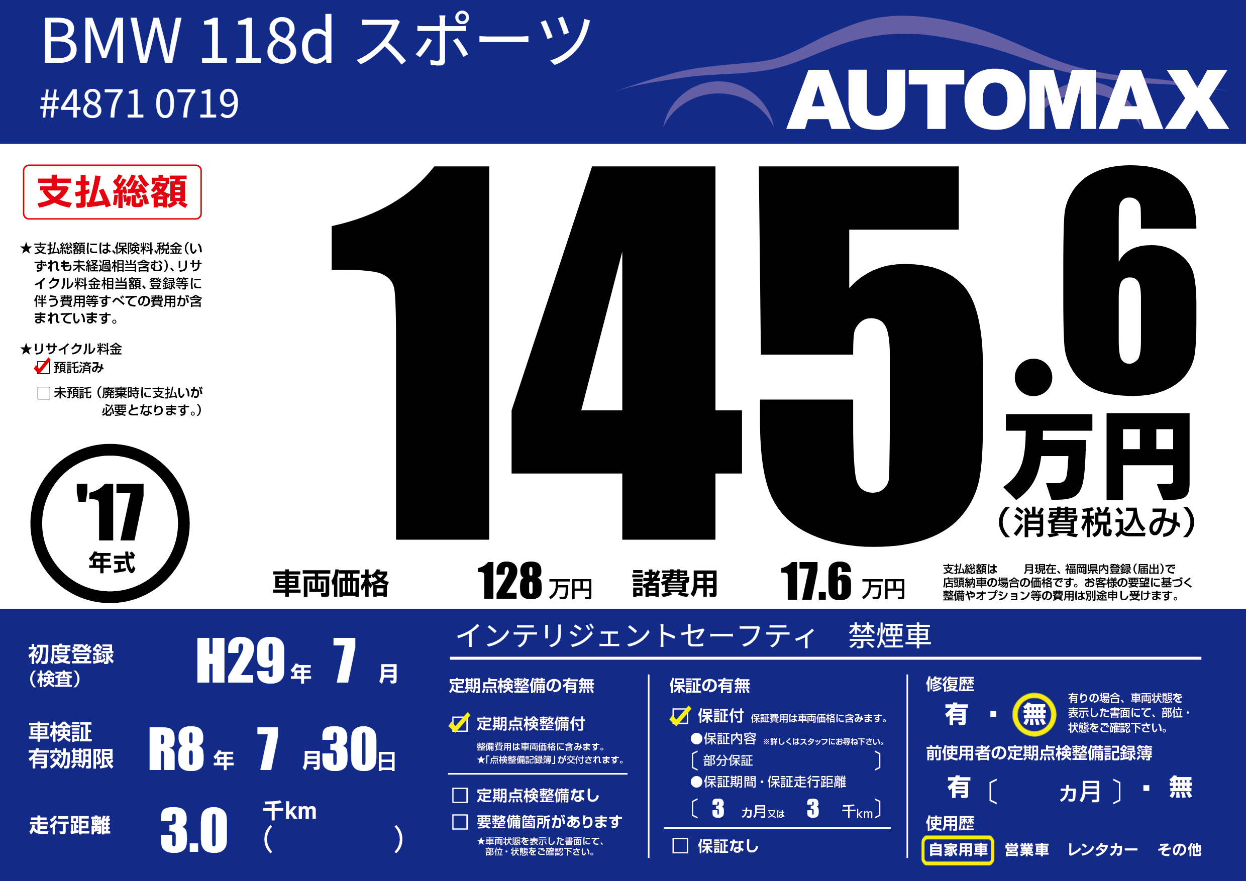 | 車名 | BMW 118d スポーツ | グレード ミッション 排気量 |