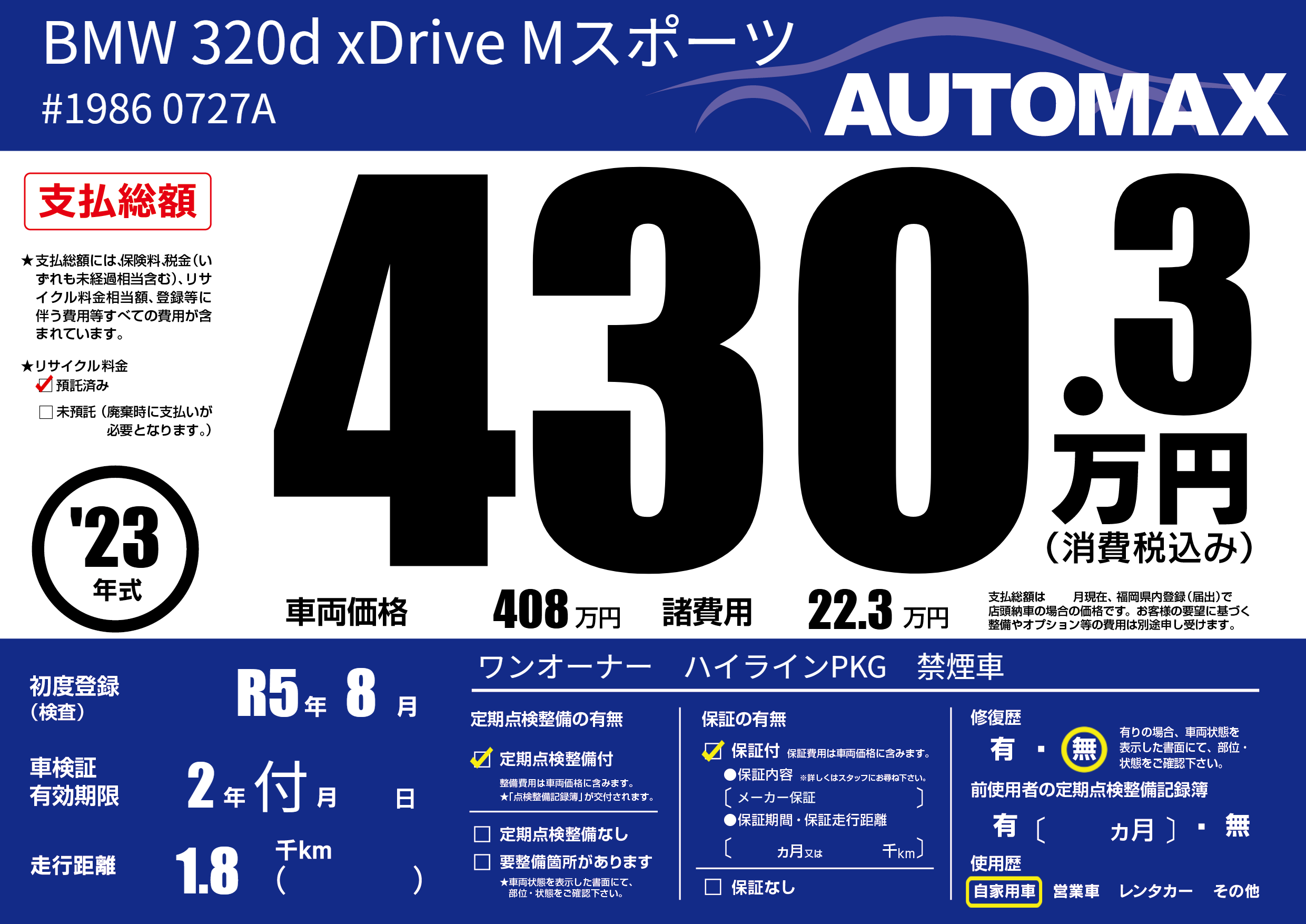| 車名 | BMW 320d xDrive Mスポーツ | グレード ミッション 排気量 |