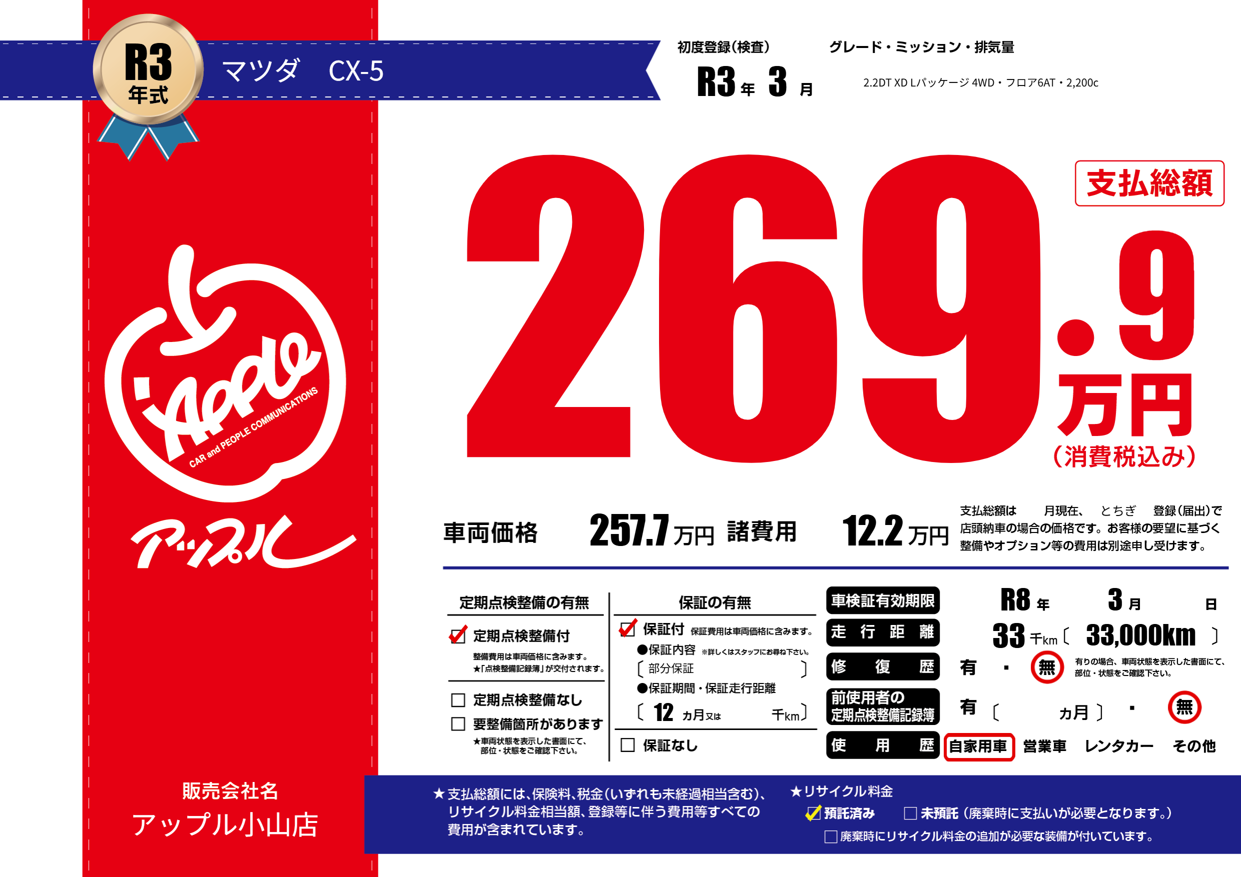 | 走行キロ | 3.3万km | 初年度登録 | R3年3月 |