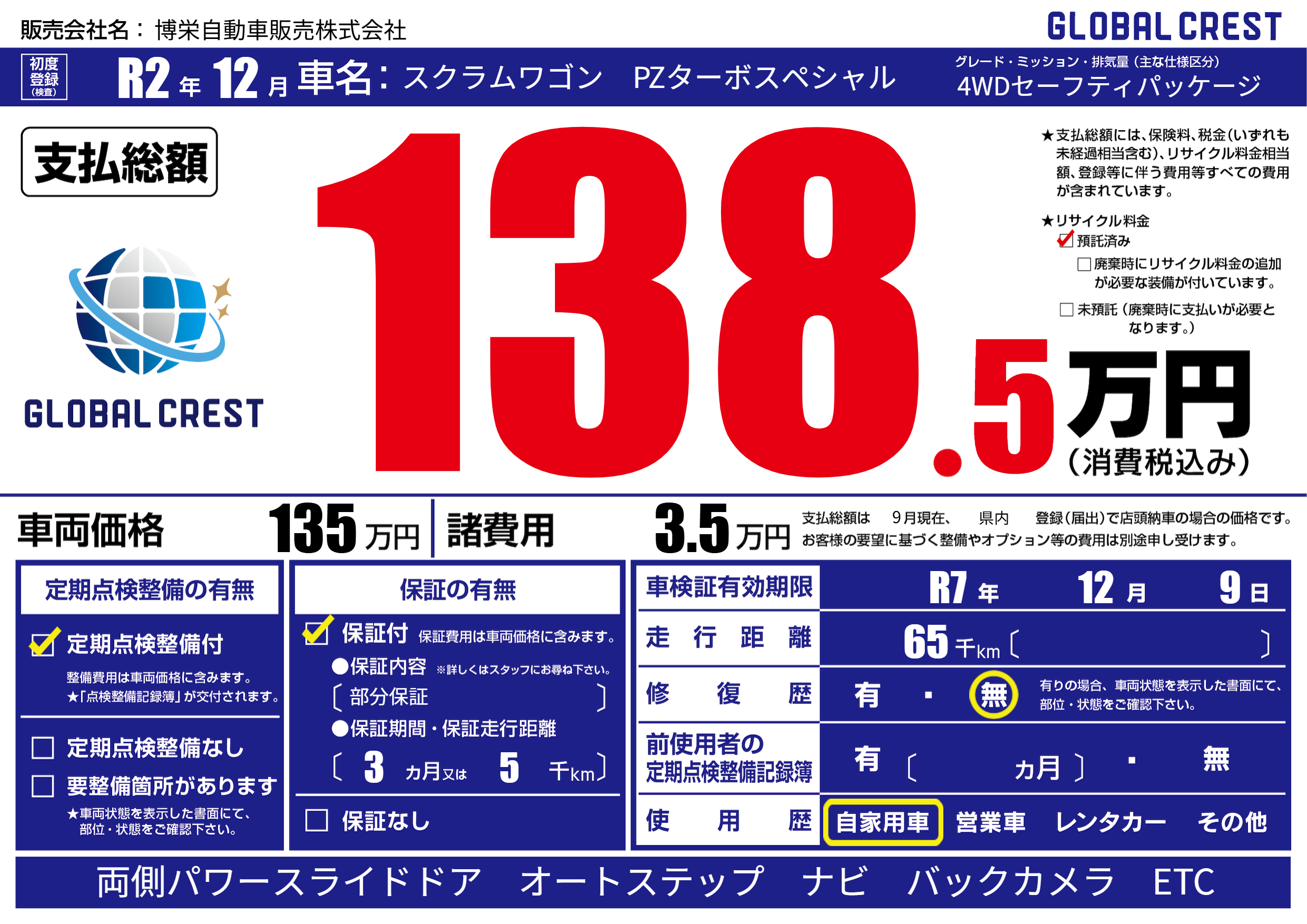 | 車名 | スクラムワゴン PZターボスペシャル | グレード ミッション 排気量 |