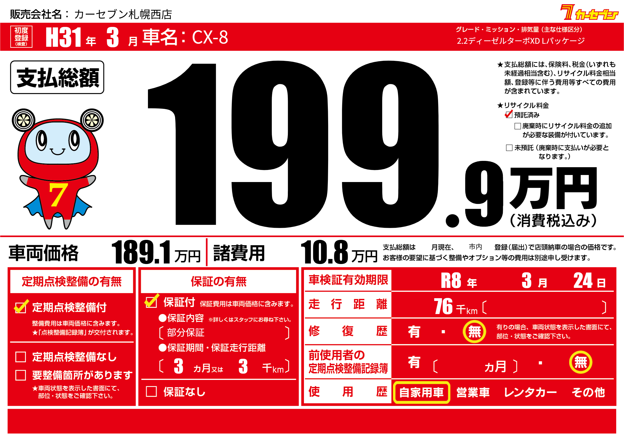 | 車名 | CX-8 | グレード ミッション 排気量 |