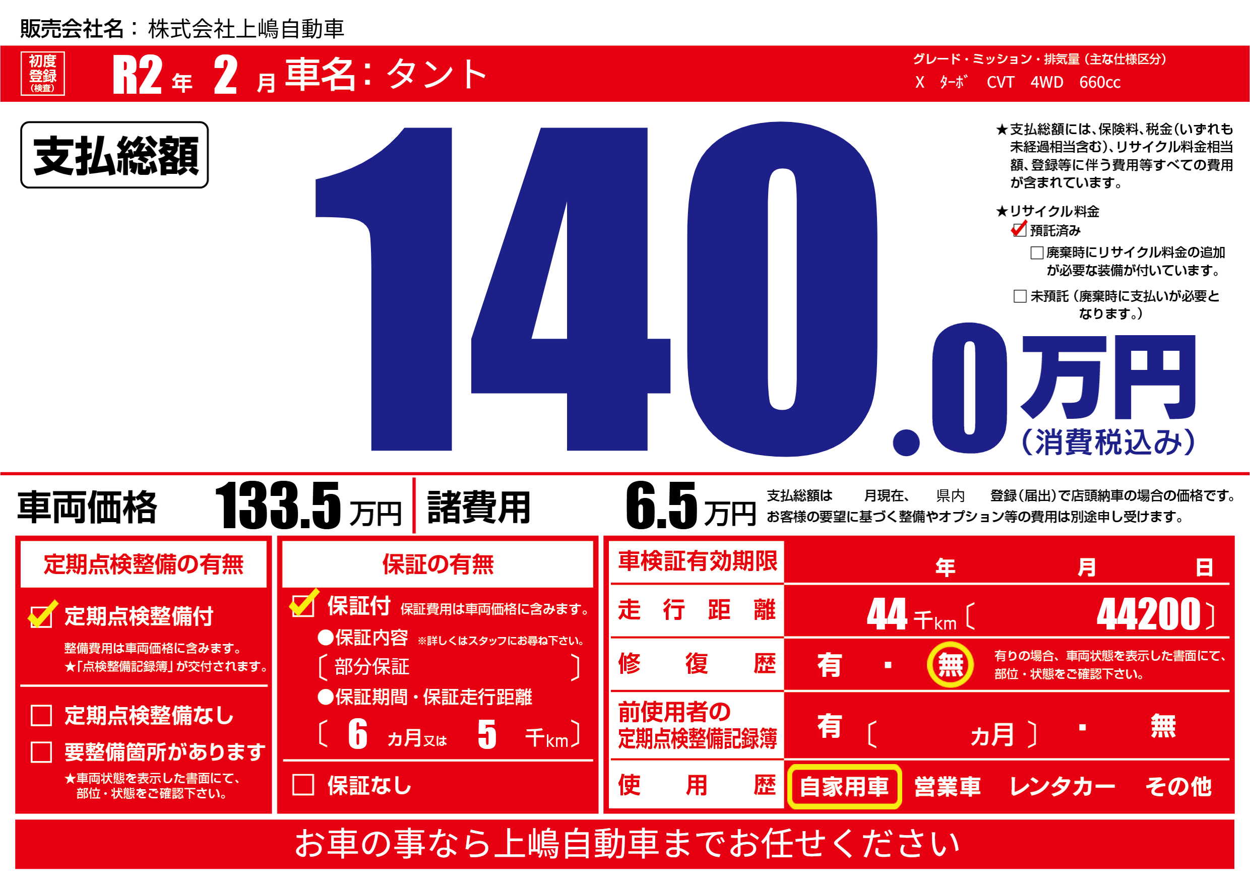 | 走行キロ | 4.4万km | 初年度登録 | R2年2月 |