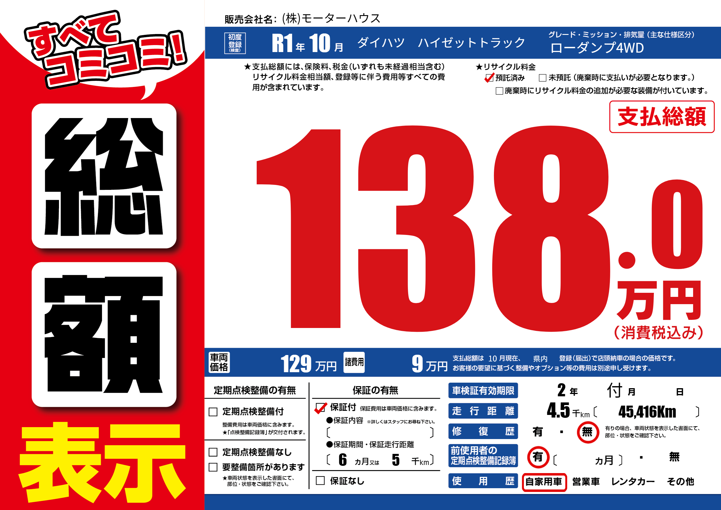 | 走行キロ | 0.4万km | 初年度登録 | R1年10月 |