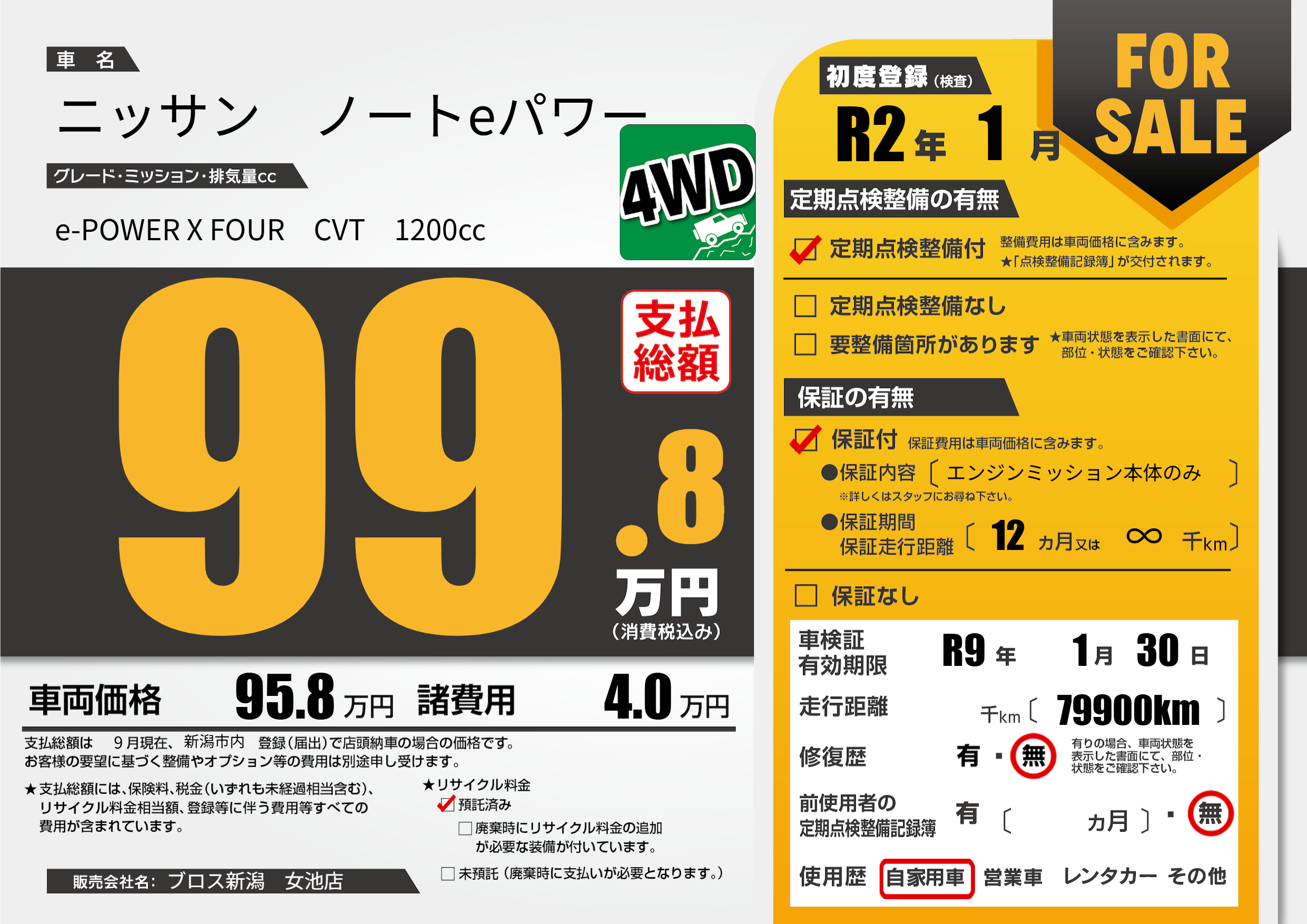 | 車名 | ニッサン ノートeパワー | グレード ミッション 排気量 |