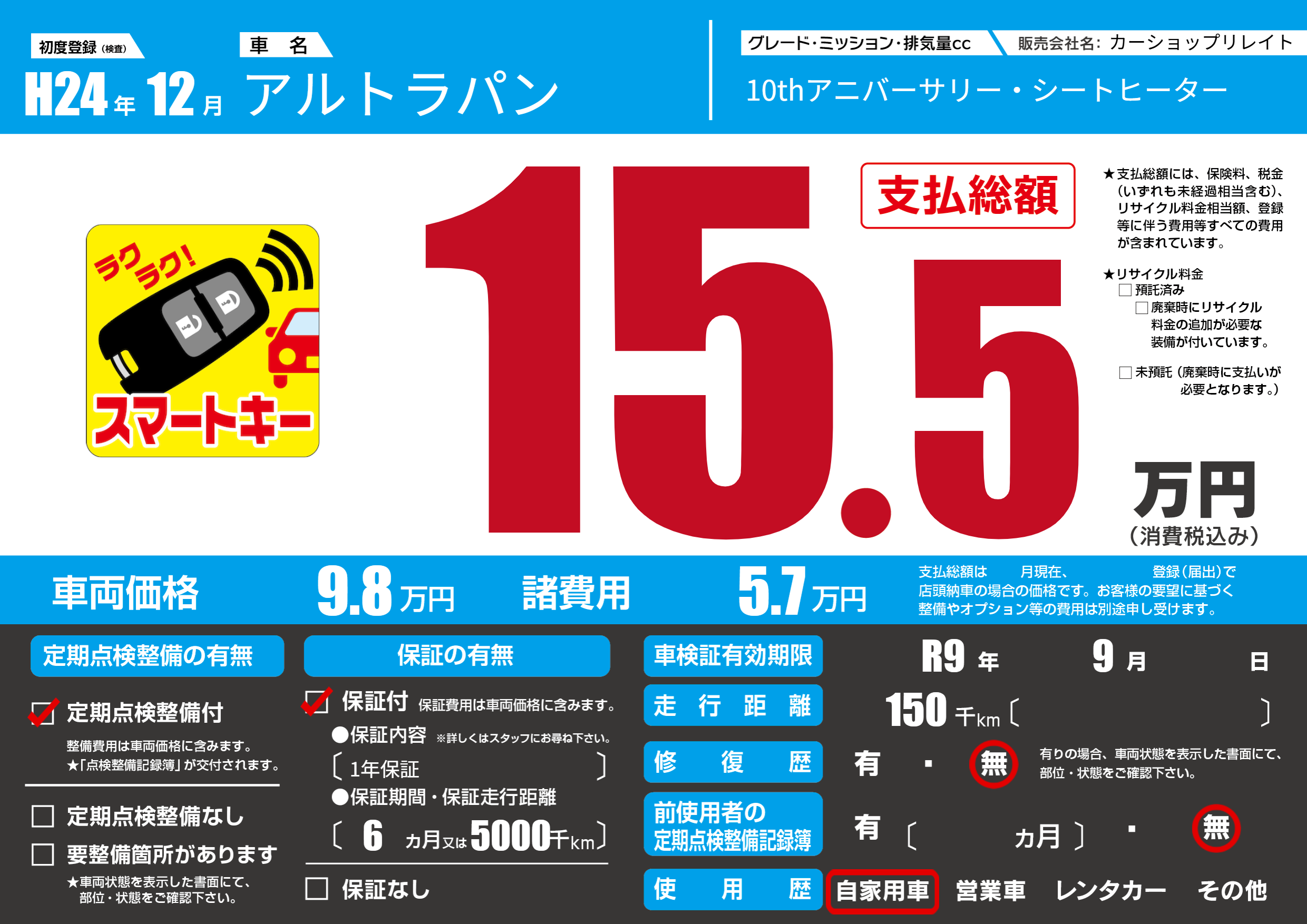 | 走行キロ | 15万km | 初年度登録 | H24年12月 |