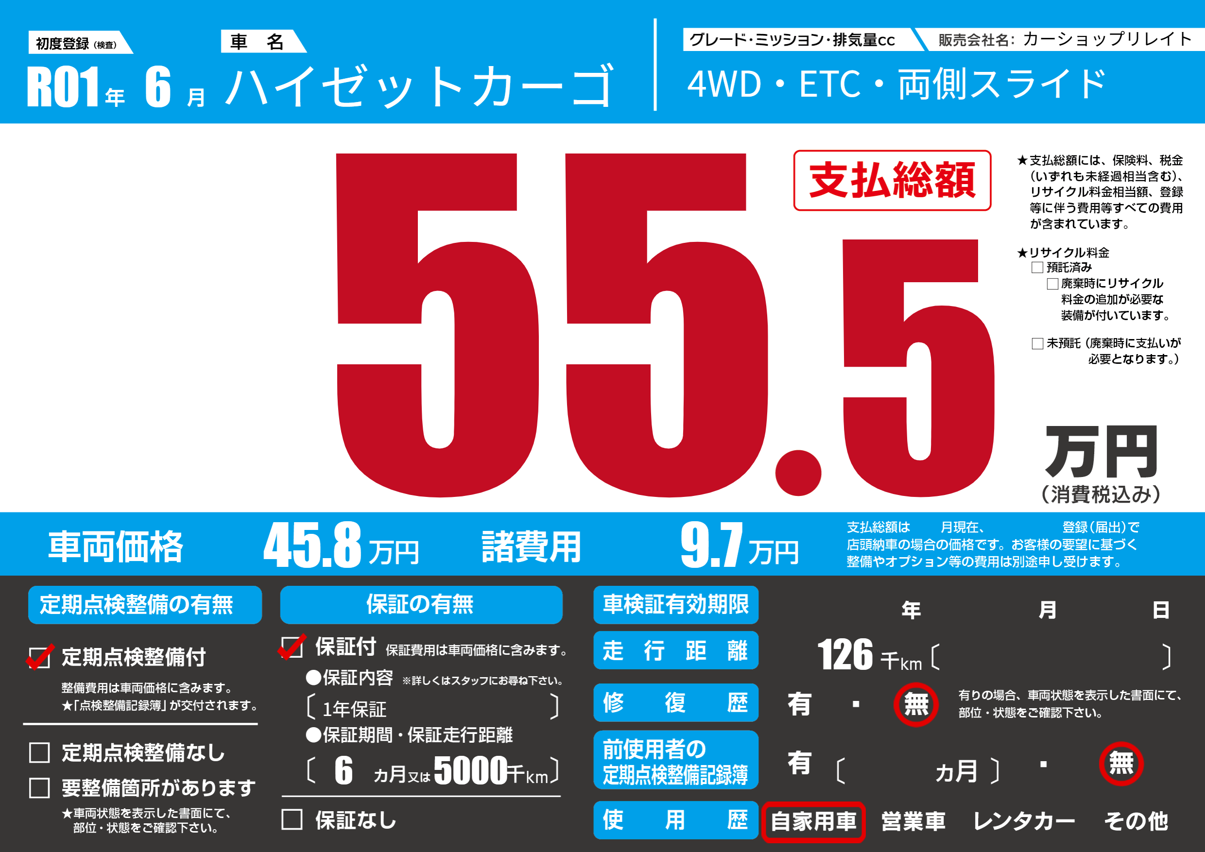 | 走行キロ | 12.6万km | 初年度登録 | R01年6月 |